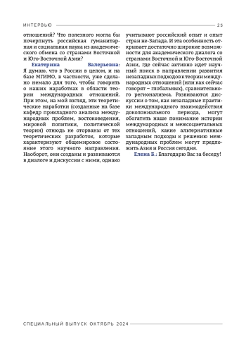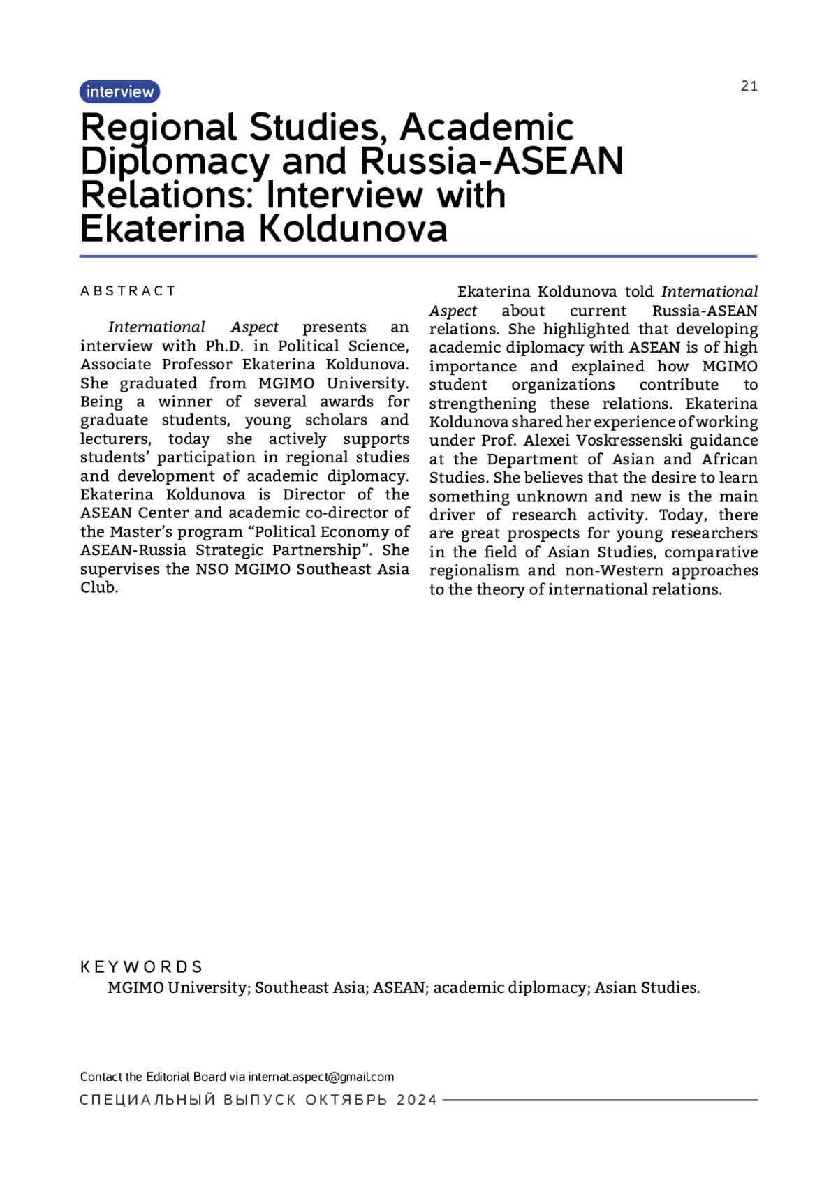 Редакция журнала «Международный аспект» представляет интервью с к. полит. н. доцентом Екатериной Валерьевной Колдуновой. Екатерина Валерьевна выпускница МГИМО МИД России, лауреат нескольких премий и конкурсов для аспирантов, молодых ученых и преподавателей, и сегодня она активно поддерживает участие студентов в регионоведческих исследованиях и развитии академической дипломатии. Е. В. Колдунова является директором Центра АСЕАН, научным соруководителем магистерской программы «Политика и экономика стратегического партнерства России и АСЕАН» и курирует Клуб Юго-Восточной Азии НСО МГИМО. В беседе Екатерина Валерьевна рассказала о современном состоянии отношений России и стран Юго-Восточной Азии, роли академической дипломатии на этом направлении, вкладе студенческих организаций МГИМО МИД России в укрепление этих отношений. Екатерина Валерьевна поделилась воспоминаниями о работе под руководством профессора А. Д. Воскресенского на Кафедре востоковедения и своей мотивацией заниматься наукой. Стремление узнать неизвестное и новое, по ее мнению, – основной двигатель научной деятельности, и сегодня открываются большие перспективы для молодых исследователей в области востоковедения, сравнительного регионализма, незападных подходов к теории международных отношений.