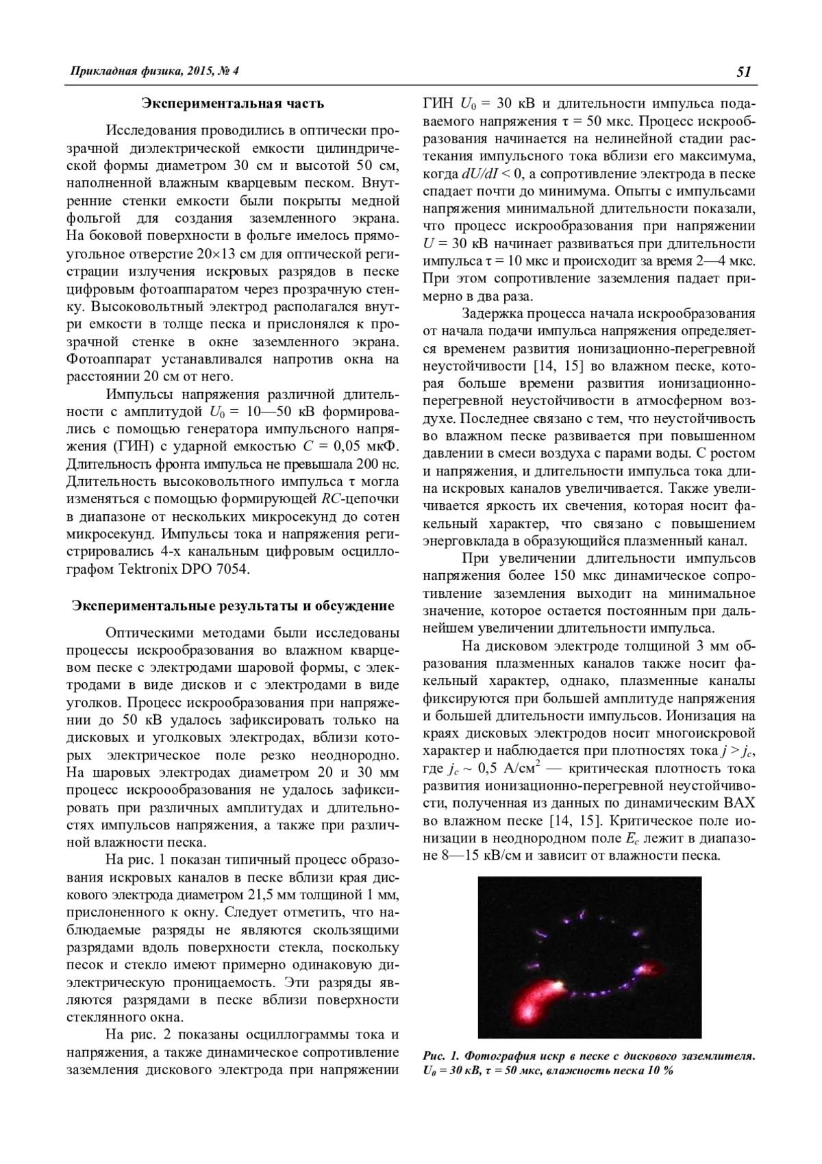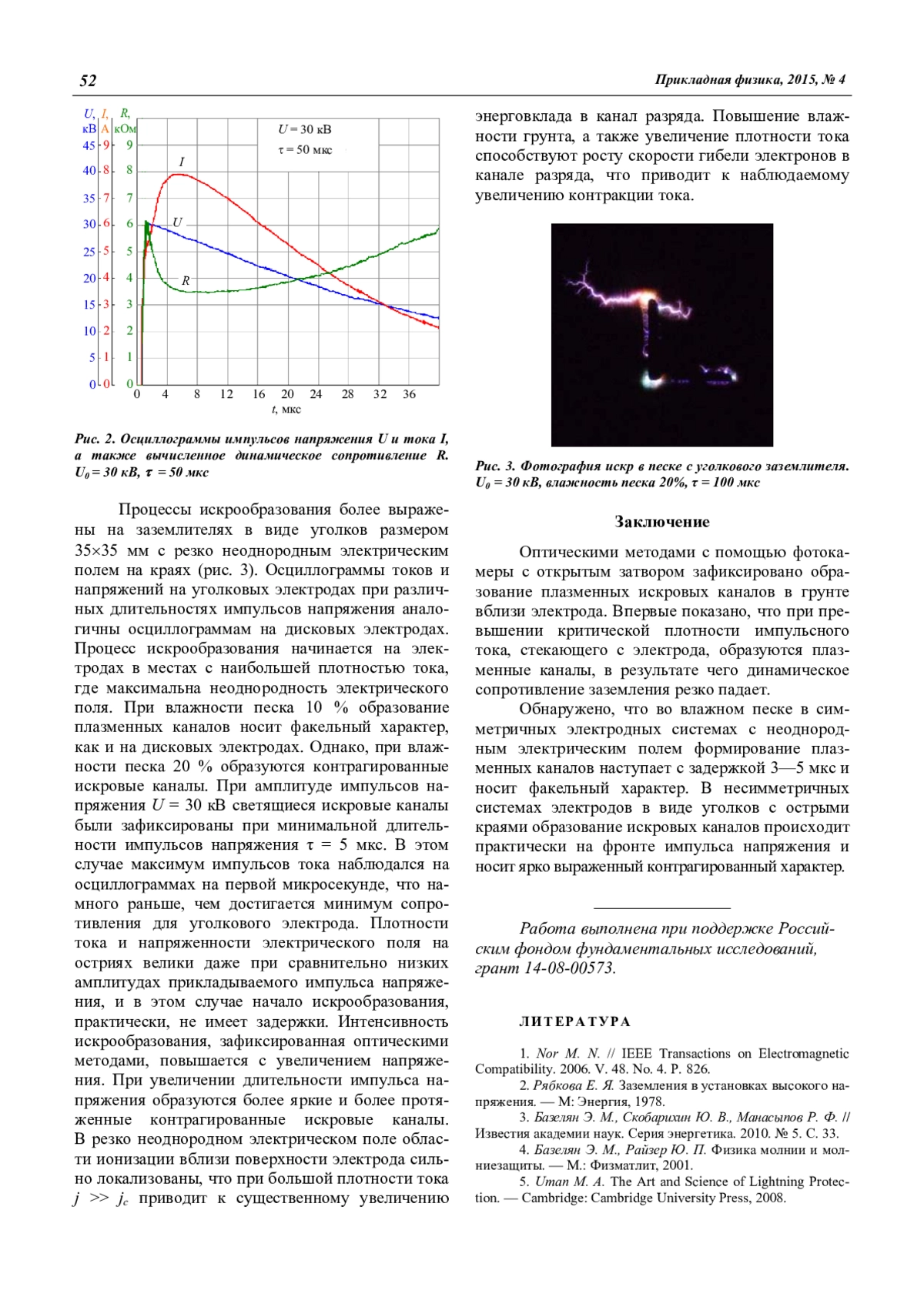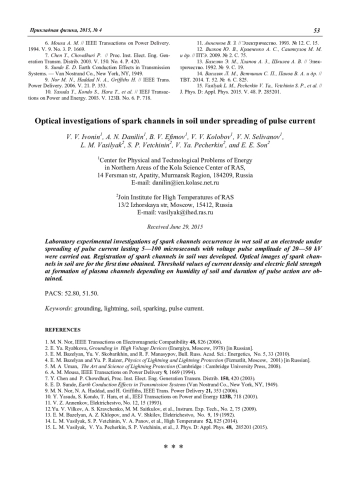 Ивонин В. В., Данилин А. Н., Ефимов Б. В., Колобов В. В., Селиванов В. Н., Василяк Л. М., Ветчинин С. П., Печеркин В. Я., Сон Э. Е. Оптические исследования искровых каналов в грунте при растекании импульсного тока 50