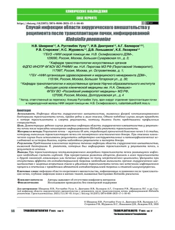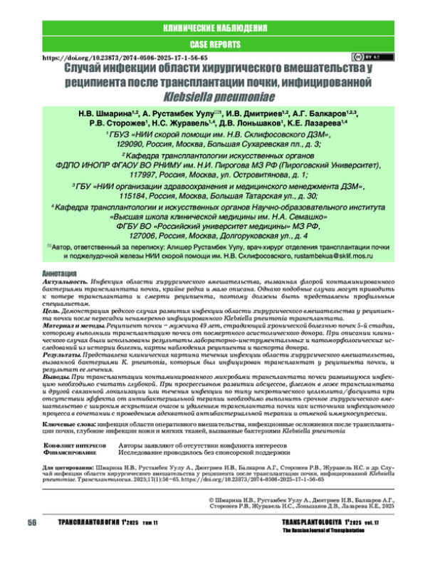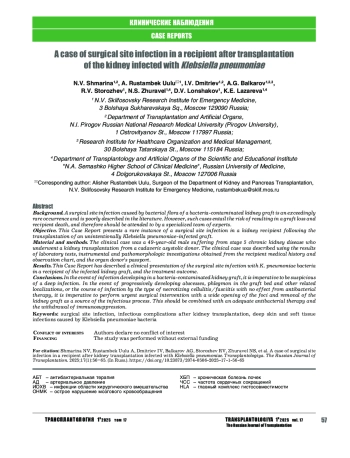 Цель. Демонстрация редкого случая развития инфекции области хирургического вмешательства у реципиента почки после пересадки ненамеренно инфицированного Klebsiella pneumonia трансплантата.