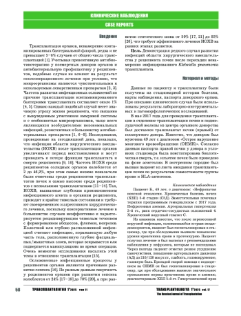 Трансплантация органов, ненамеренно контаминированных бактериальной флорой, редка и не превышает 5–6% случаев от общего числа трансплантаций [1]. Учитывая превентивную антибиотикотерапию у посмертных доноров органов и антибактериальную профилактику у реципиентов, подобные случаи не влияют на результат послеоперационного лечения при условии, что микроорганизмы являются чувствительными к используемым лекарственным препаратам [2, 3].