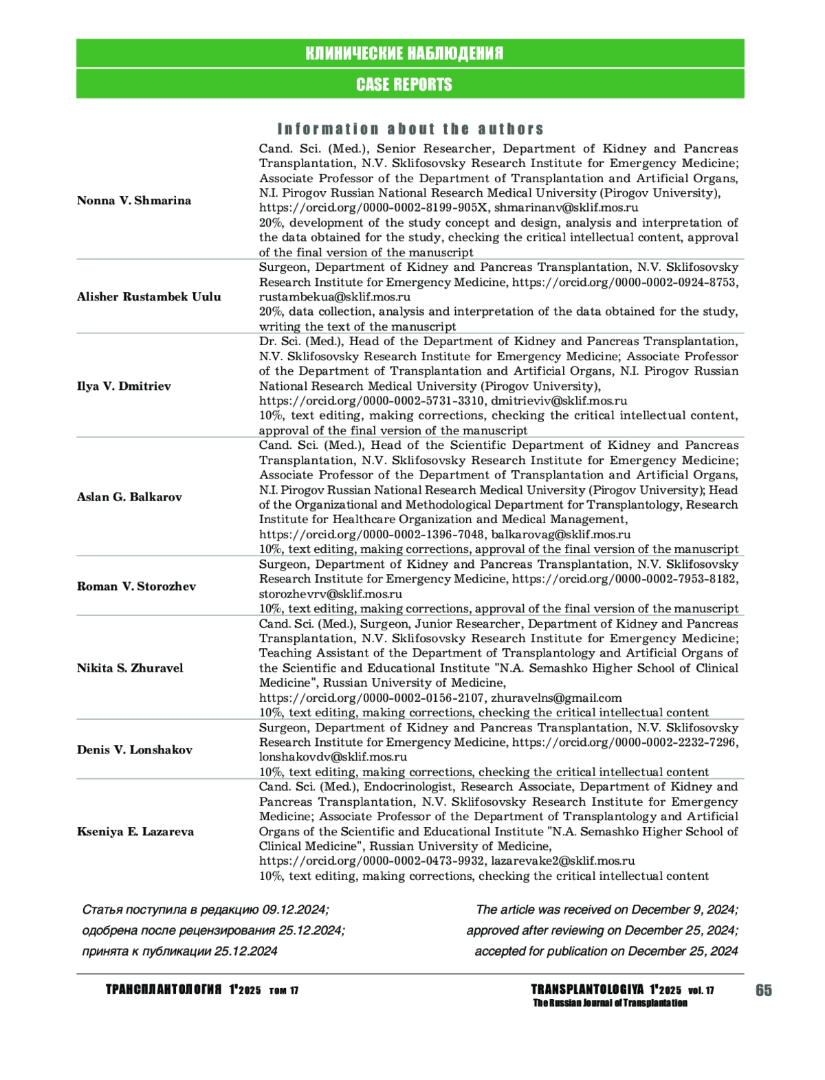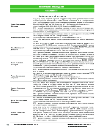 Заключение. Ортотопическую трансплантацию почки целесообразно рассматривать в качестве альтернативного решения при облитерации и тромбозе подвздошных вен или выраженном атеросклеротическом поражении подвздошных артерий реципиента. Метод может быть использован у реципиентов с двумя и более предшествующими трансплантациями почки.