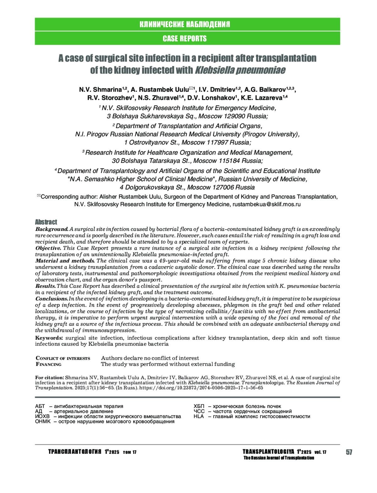 Выводы. При трансплантации контаминированного микробами трансплантата почки развившуюся инфекцию необходимо считать глубокой. При прогрессивном развитии абсцессов, флегмон в ложе трансплантата и другой связанной локализации или течения инфекции по типу некротического целлюлита/фасциита при отсутствии эффекта от антибактериальной терапии необходимо выполнить срочное хирургического вмешательство с широким вскрытием очагов и удалением трансплантата почки как источника инфекционного процесса в сочетании с проведением адекватной антибактериальной терапии и отменой иммуносупрессии.