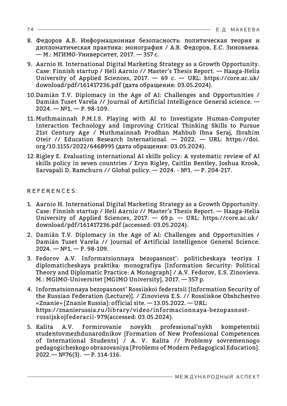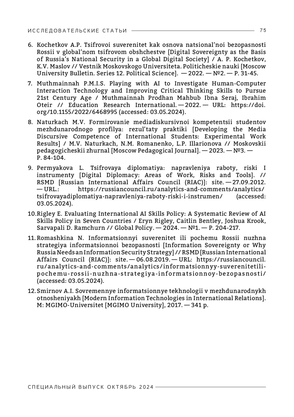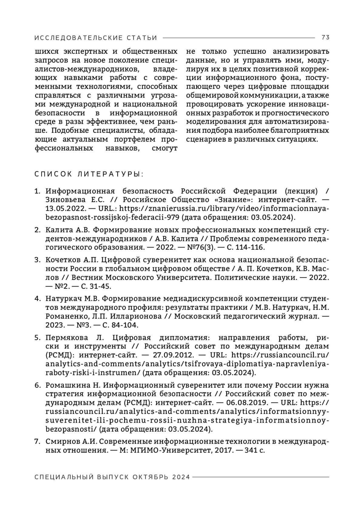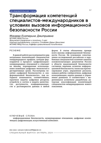 В данной работе рассматривается ряд актуальных компетенций специалистов международного профиля, которые формируются в процессе «цифровизации» международных отношений и отвечают на вызовы, порождаемые использованием новейших цифровых технологий в деструктивных целях. Рассмотрены понятия «цифровой безопасности» и «информационной безопасности», под которыми понимаются, соответственно, практики защиты цифровых ресурсов, устройств и систем и защита целостности, доступности, конфиденциальности и достоверности данных в любой форме. В статье обозначены прежде всего вызовы информационной безопасности России. На основании сопоставления исследований российских и зарубежных специалистов и контент-анализа основополагающих документов России в области национальной безопасности составлен перечень аспектов информационной безопасности, таких как прогнозирование угроз, управление рисками, навыки работы с нейросетями, цифровая коммуникация, анализ данных и управление данными. В соответствии с выделенными аспектами разработана авторская классификация компетенций специалистов-международников нового поколения.
