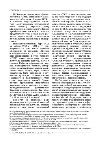 11. Политика и безопасность в Африке: вызовы и возможности для России: аналитический доклад / И.Д.Лошкарев, Л.Е.Чкония, М.В.Никольская. - Москва: МГИМО-Университет, 2022. - 15 с.