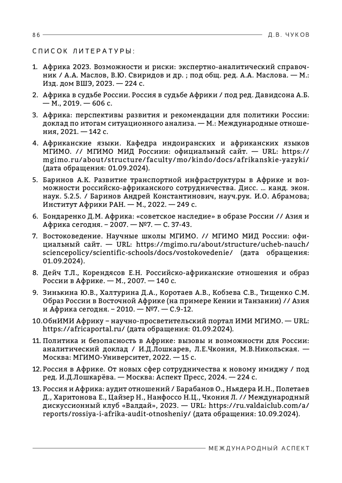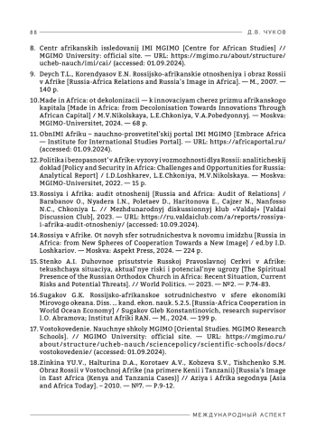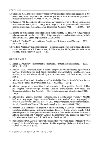 13. Россия и Африка: аудит отношений / Барабанов О., Ньядера И.Н., Полетаев Д., Харитонова Е., Цайзер Н., Нанфоссо Н.Ц., Чкония Л. // Международный дискуссионный клуб «Валдай», 2023. - URL: https://ru.valdaiclub.com/a/reports/rossiya-i-afrika-audit-otnosheniy (дата обращения: 10.09.2024).