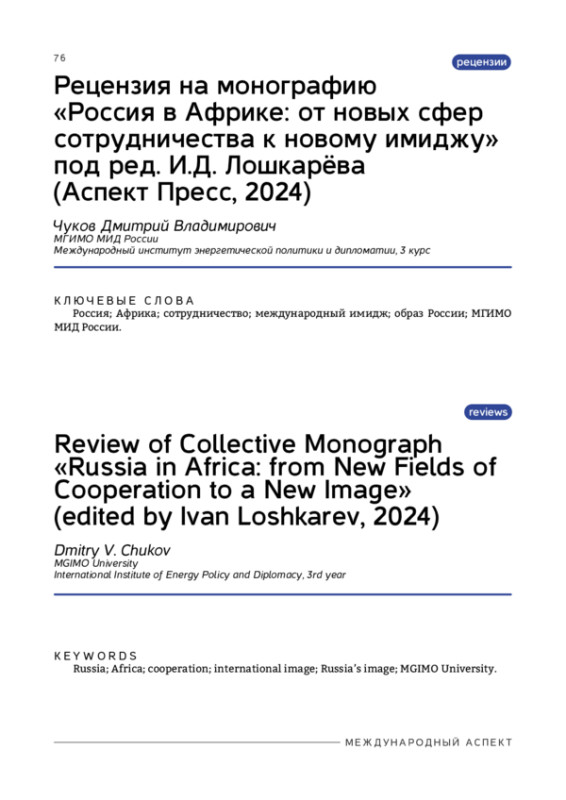 Рецензия на монографию «Россия в Африке: от новых сфер сотрудничества к новому имиджу» под ред. И. Д. Лошкарёва (Аспект Пресс, 2024)