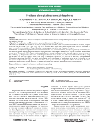 В публикациях по ожоговой травме за период более 50 лет рассмотрен большой круг вопросов по патогенезу термической травмы, инфузионной терапии, сепсису, иммунным нарушениям, гиперметаболизму, ингаляционной травме (ИТ), ранним и отсроченным некрэктомиям, раневым покрытиям, заживлению ран и образованию рубцов [1]. С начала XXI века показатели выживаемости после термической травмы улучшились, а уровень раневых инфекций и сепсиса снизился. Это обусловлено прежде всего внедрением в широкую практику раннего хирургического лечения глубоких ожогов, которое считается золотым стандартом, но его безопасность и эффективность, а также сроки проведения ранней некрэктомии (НЭ) и аутодермопластики (АДП) все еще обсуждаются [2–5]. Результаты хирургического лечения оценивают в зависимости от показателей, которые относят к предикторам неблагоприятного исхода ожоговой травмы: площади ожога, возраста пациентов, наличия ИТ [6], а также сроков пребывания в стационаре, потребности в искусственной вентиляции легких (ИВЛ), частоты осложнений и летальности.