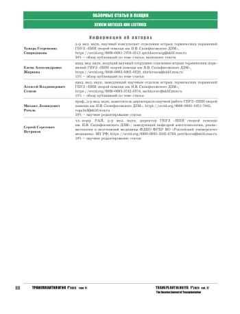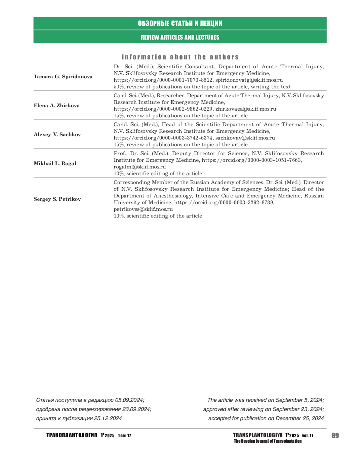 52. Жиркова Е.А., Спиридонова Т.Г., Сачков А.В., Синякова О.Г., Елисеенкова Е.И., Медведев А.О. и др. Стратификация пациентов с ожоговой травмой по риску летального исхода на основе пересмотренного индекса Франка. Анестезиология и реаниматология. 2024;(2):32-38.