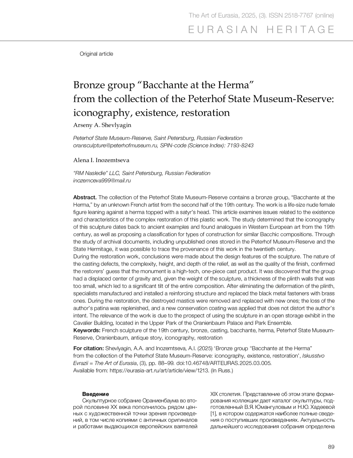 The collection of the Peterhof State Museum-Reserve contains a bronze group, “Bacchante at the Herma,” by an unknown French artist from the second half of the 19th century. The work is a life-size nude female figure leaning against a herma topped with a satyr’s head. This article examines issues related to the existence and characteristics of the complex restoration of this plastic work. The study determined that the iconography of this sculpture dates back to ancient examples and found analogues in Western European art from the 19th century, as well as proposing a classification for types of construction for similar Bacchic compositions. Through the study of archival documents, including unpublished ones stored in the Peterhof Museum-Reserve and the State Hermitage, it was possible to trace the provenance of this work in the twentieth century. During the restoration work, conclusions were made about the design features of the sculpture. The nature of the casting defects, the complexity, height, and depth of the relief, as well as the quality of the finish, confirmed the restorers’ guess that the monument is a high-tech, one-piece cast product. It was discovered that the group had a displaced center of gravity and, given the weight of the sculpture, a thickness of the plinth walls that was too small, which led to a significant tilt of the entire composition. After eliminating the deformation of the plinth, specialists manufactured and installed a reinforcing structure and replaced the black metal fasteners with brass ones. During the restoration, the destroyed mastics were removed and replaced with new ones; the loss of the author’s patina was replenished, and a new conservation coating was applied that does not distort the author’s intent. The relevance of the work is due to the prospect of using the sculpture in an open storage exhibit in the Cavalier Building, located in the Upper Park of the Oranienbaum Palace and Park Ensemble.