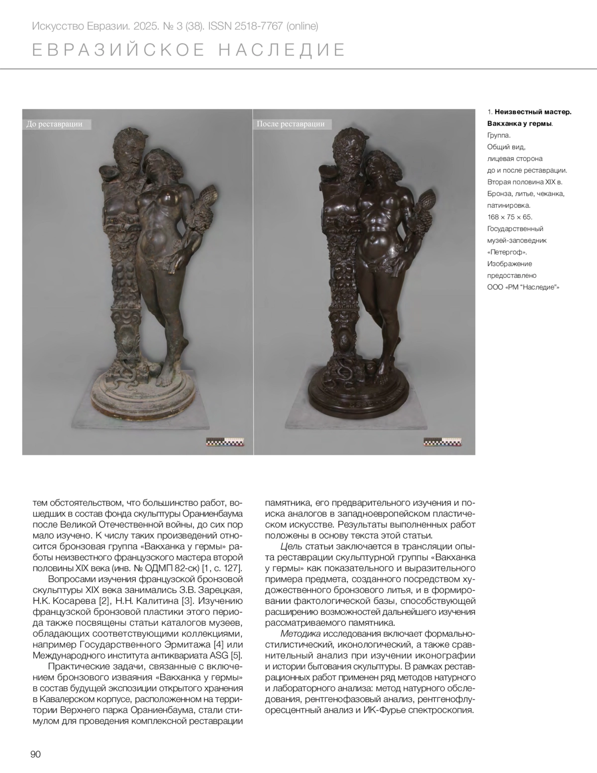 В собрании Государственного музея-заповедника «Петергоф» хранится бронзовая группа «Вакханка у гермы» работы неизвестного французского мастера второй половины XIX века. Произведение представляет собой выполненную в человеческий рост обнаженную женскую фигуру, прислонившуюся к герме, увенчанной головой сатира. В статье рассматриваются вопросы, связанные с бытованием пластической работы и особенностями ее комплексной реставрации. В исследовании определено, что иконография изваяния восходит к античным образцам, найдены аналоги в западноевропейском искусстве XIX столетия, предложена классификация видов построения сходных вакхических композиций. Изучение архивных документов, в том числе неопубликованных, хранящихся в Государственном музее-заповеднике «Петергоф» и Государственном Эрмитаже, позволили узнать провенанс произведения в XX веке. В процессе реставрационных работ сделаны выводы о конструктивных особенностях скульптуры. Характер дефектов литья, особенности проработки рельефа, а также качество отделки подтвердили догадку реставраторов о том, что памятник является высокотехнологичным цельнолитым изделием. Обнаружено, что группа имела смещенный центр тяжести и, с учетом веса скульптуры, слишком малую толщину стенок плинта, что приводило к значительному крену всей композиции. После устранения деформации плинта специалистами произведены изготовление и установка усиливающей конструкции, осуществлена замена креплений из черного металла на латунные. В ходе реставрации деструктированные мастиковки удалены и заменены новыми; восполнены утраты авторской патины, нанесено новое, не искажающее авторского замысла консервационное покрытие. Актуальность работы обусловлена перспективой использования скульптуры в экспозиции открытого хранения в Кавалерском корпусе, расположенном в Верхнем парке дворцово-паркового ансамбля «Ораниенбаум».