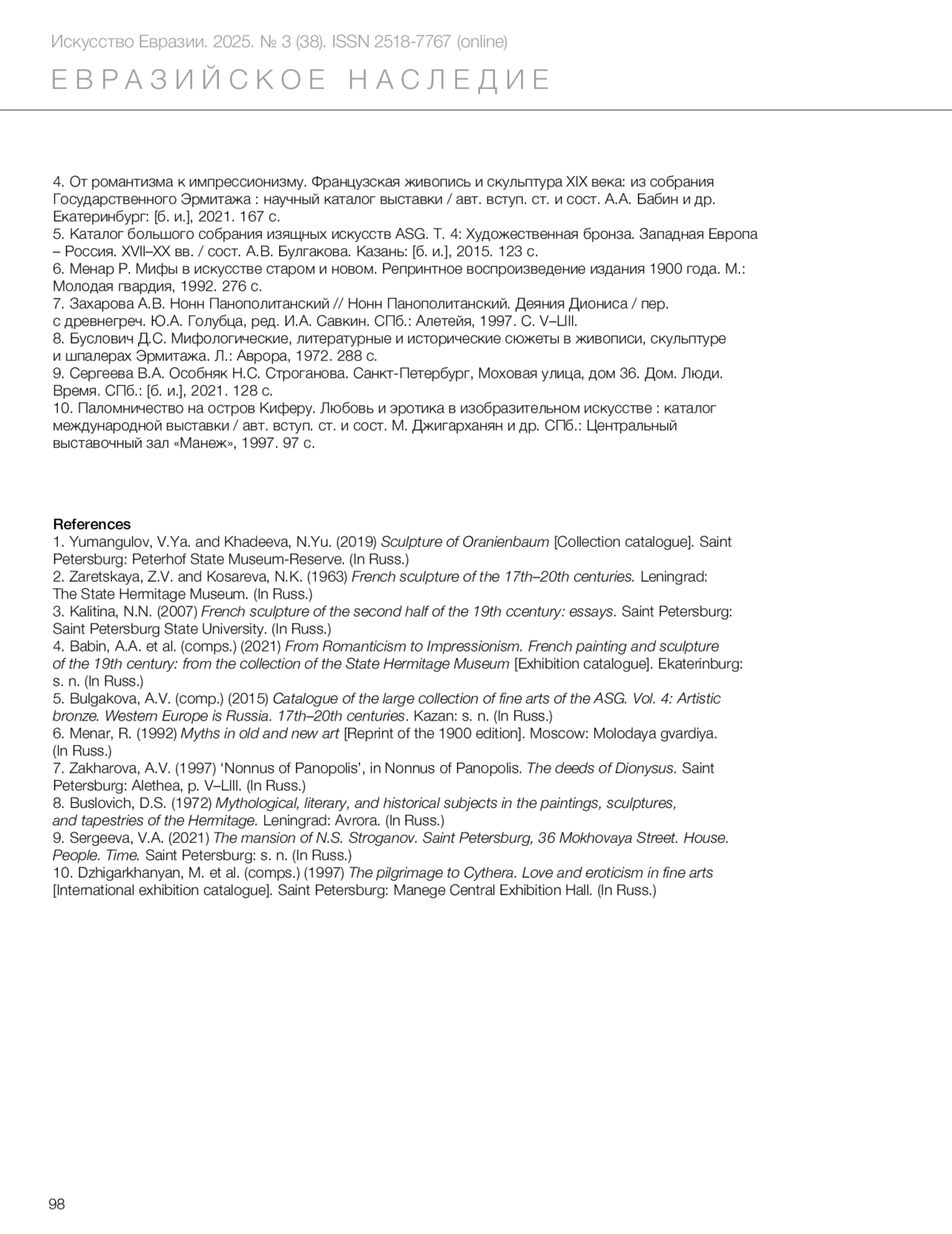 4. Babin, A.A. et al. (comps.) (2021) *From Romanticism to Impressionism. French painting and sculpture of the 19th century: from the collection of the State Hermitage Museum* [Exhibition catalogue]. Ekaterinburg: s. n. (In Russ.)