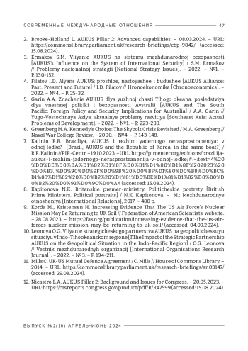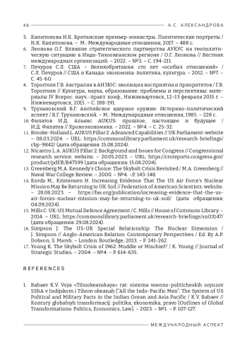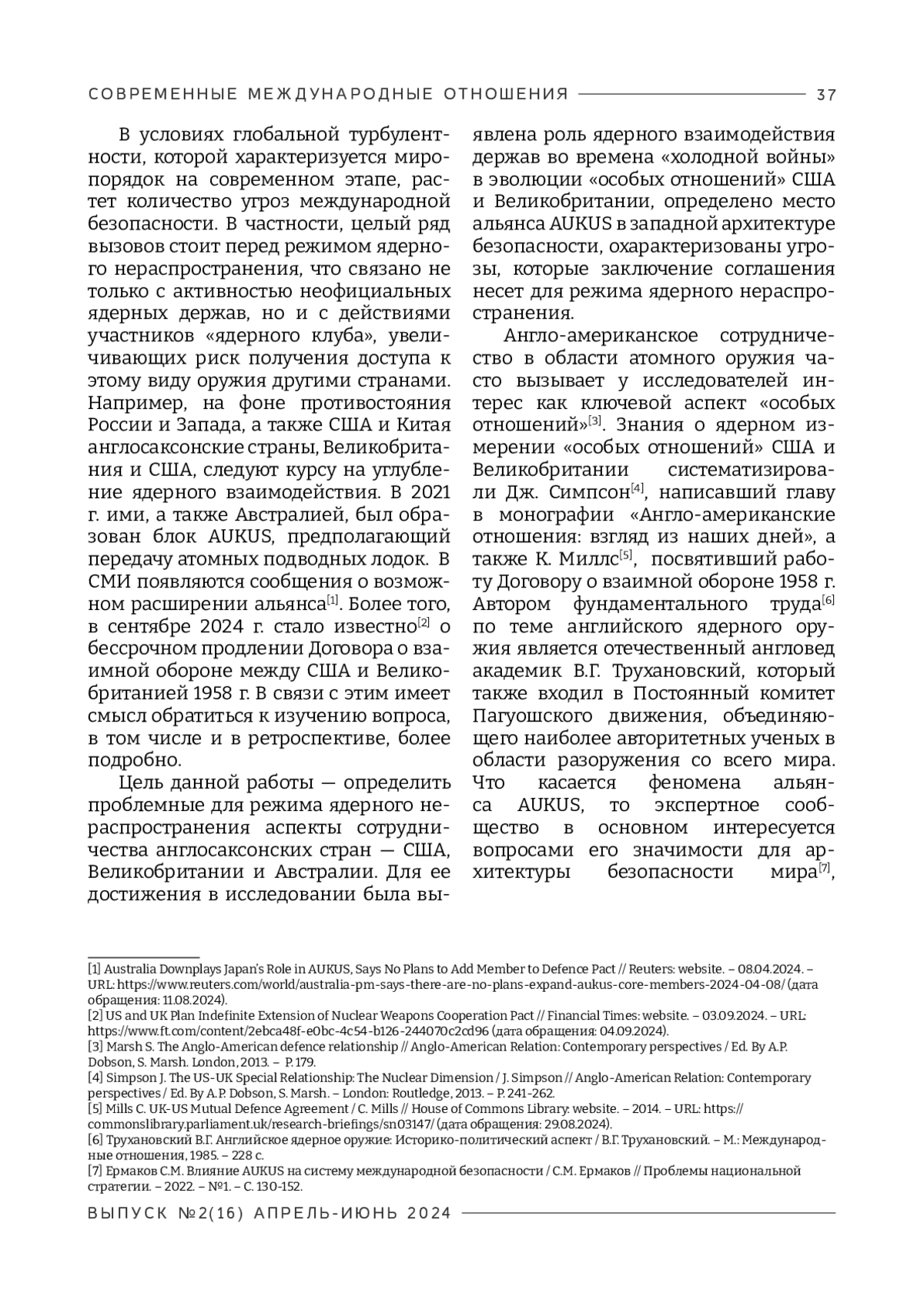 Статья посвящена проблеме сотрудничества США, Великобритании и Австралии в ядерной сфере. Актуальность темы обусловлена ростом количества угроз международному режиму нераспространения ядерного оружия, которые исходят не только от неофициальных ядерных держав, но и от официальных. Особое внимание уделено рассмотрению эволюции форм взаимодействия государств со времён начала «холодной войны», что объясняется важностью этапа в формировании основных принципов сотрудничества стран в ядерном измерении. Помимо этого, определено место альянса AUKUS в западной архитектуре безопасности, охарактеризованы угрозы, которые заключение соглашения несёт для режима ядерного нераспространения. Рассмотрение обеих тем — британско-американского ядерного взаимодействия в ХХ веке и современного сотрудничества в рамках AUKUS — позволит определить трансформацию подходов англосаксонских стран по отношению к передаче ядерных технологий другим странам. В связи с этим в основе методологии, используемой автором, лежит историко-генетический подход. Автор отмечает, что во второй половине ХХ века США создали механизм передачи ядерных материалов и информации в области атома другой ядерной державе — Великобритании, и с тех пор британские силы ядерного сдерживания находятся в зависимости от партнёра. В настоящее время связь в этой области укрепляется, показателем чего является решение о бессрочном продлении Договора о взаимной обороне 1958 г. В 20-х годах XXI века с созданием альянса AUKUS более ярким участником англосаксонского сотрудничества в ядерной сфере стала Австралия. Идёт работа над созданием нового механизма по передаче ей — стране, не обладающей ядерным оружием — атомных подводных лодок на ядерном топливе, не предполагающих размещения на них ядерных взрывных устройств. Таким образом, сделан вывод о том, что сотрудничество англосаксонских стран в данной области сопровождается созданием опасного для режима нераспространения ядерного оружия прецедента, а также создаёт риски распространения практики среди других игроков и дискредитации существующих международных институтов, прежде всего МАГАТЭ.