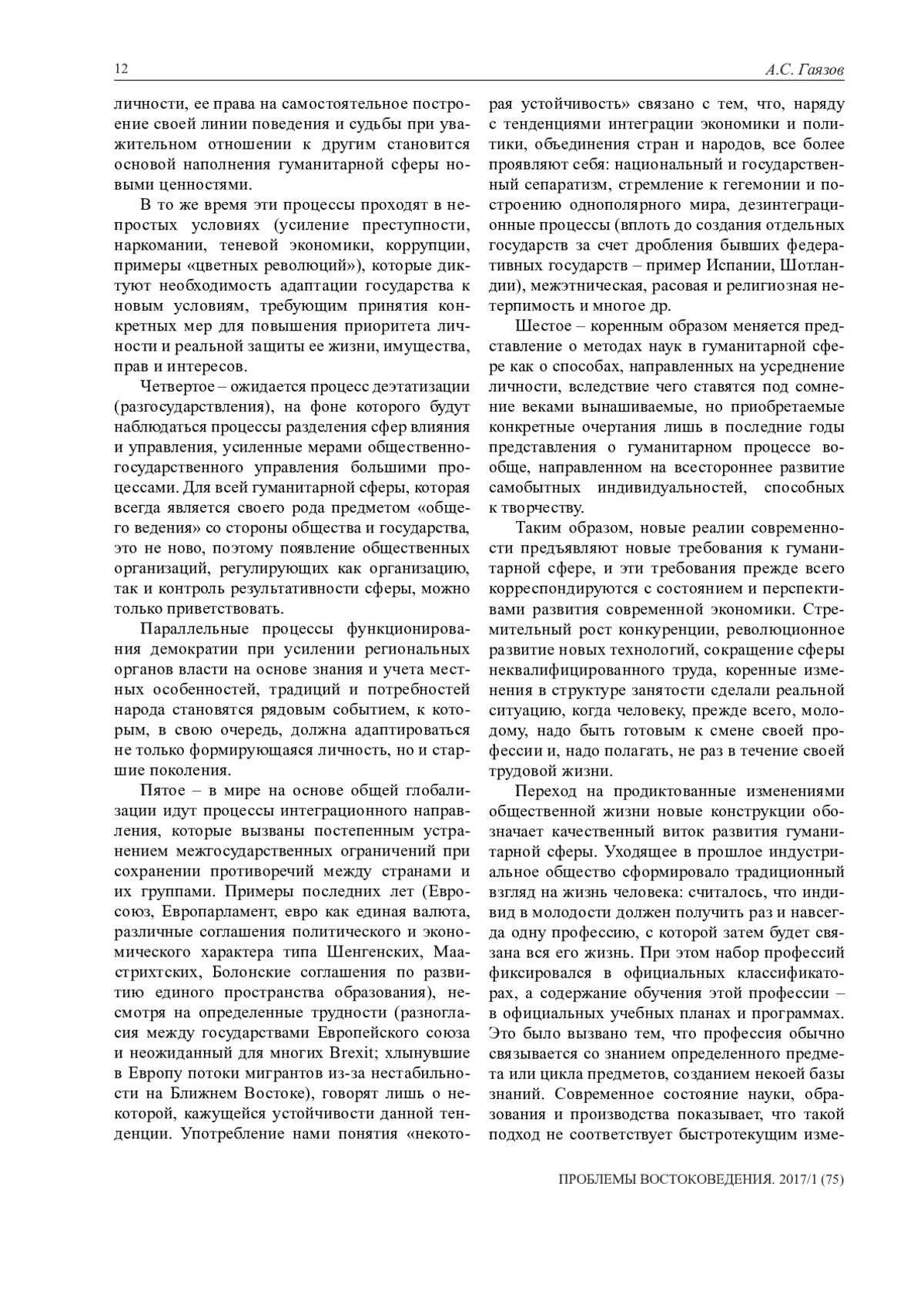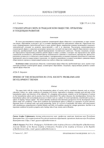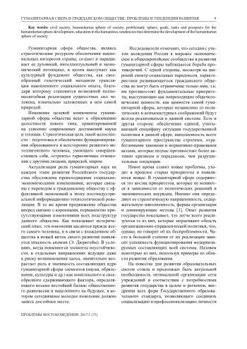 В статье рассматриваются вопросы развития гуманитарной сферы общества и составляющих ее ядро элементов (науки, образования, культуры и др.) в условиях формирующегося гражданского общества. Определены подходы к формированию стратегической цели и задач данной сферы, направления влияния меняющейся социальноэкономической ситуации на развитие представлений о ней и ее практики. Рассмотрена взаимозависимость гуманитарной сферы и социально-культурных процессов, в которой она выступает сферой общественного воспроизводства, преобразующей силой, сферой формирования «человеческого капитала». Указаны тенденции, которыми определяются перспективы развития данной сферы в новых условиях, в которых она определяется как гарант социальной сплоченности, действенный фактор национального единения и социального партнерства, фактор возрождения духовности и этнического самосознания с одновременным осознанием мировой идентичности и высоких гражданских качеств подрастающего поколения, что является важнейшим условием позитивного движения вперед общественного процесса, непреходящей ценностью любого общества и цивилизации