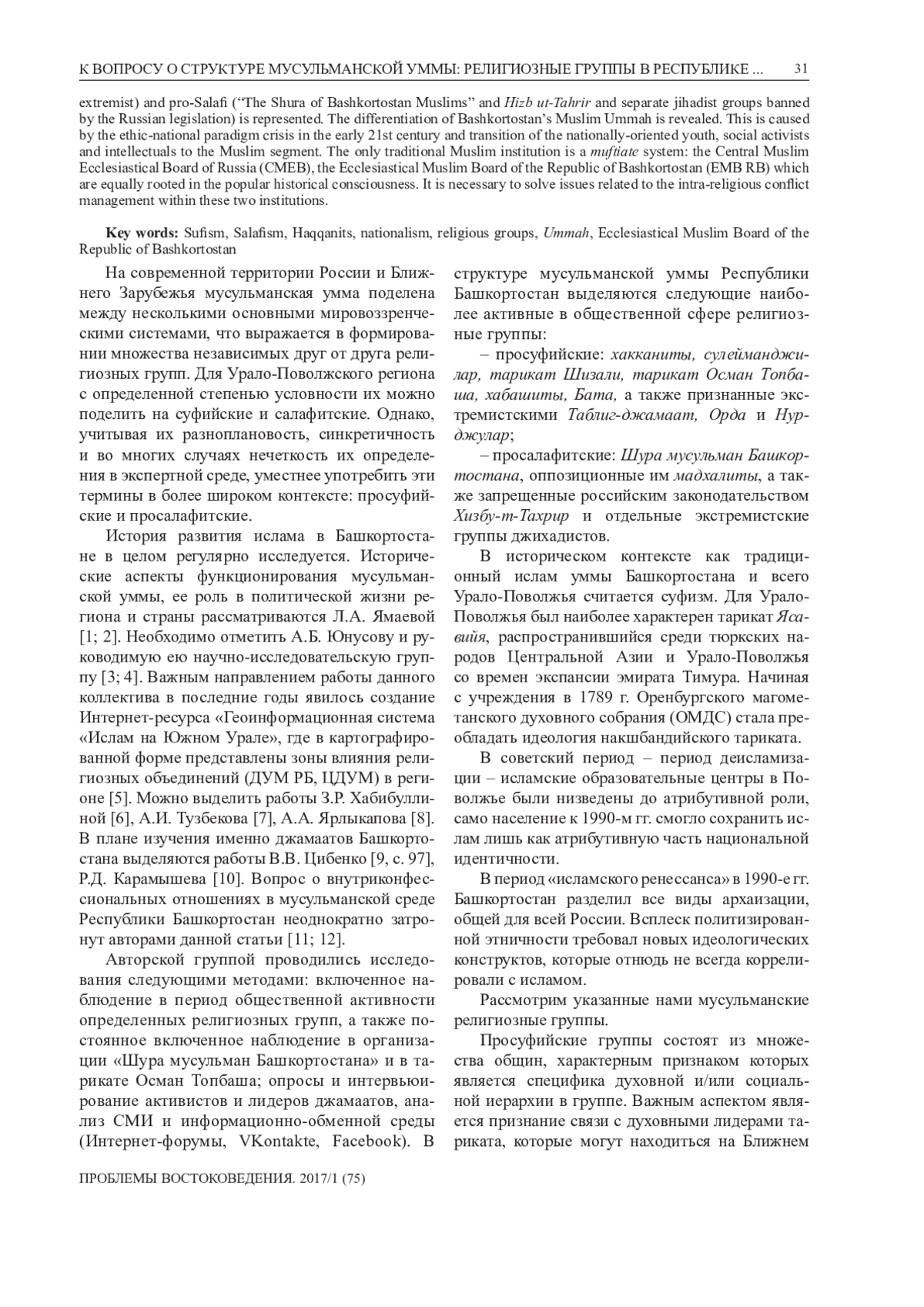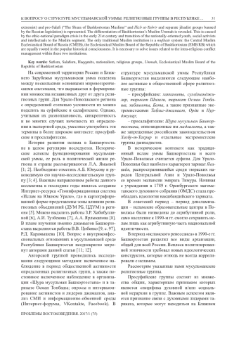 В статье рассмотрена структура мусульманской уммы Башкортостана через анализ религиозных групп (джамаатов), генезиса и специфики их социальной организации, ориентации религиозной догматики, отношения к государству и друг к другу; представлено деление на просуфийские (хакканиты, сулейманджилар, тарикат Шизали, тарикат Осман Топбаша, хабашиты, Бата, а также признанные экстремистскими Таблиг-джамаат, Орда и Нурджулар) и просалафитские религиозные группы («Шура мусульман Башкортостана», мадхалиты, а также запрещенные российским законодательством Хизбу-т-Тахрир и отдельные экстремистские группы джихадистов). Выявлена дифференциация мусульманской уммы Башкортостана. Ее причинами являются кризис этнонациональной парадигмы в начале XXI в. и переход национально-ориентированной молодежи, общественников и интеллектуалов в мусульманский сегмент. В Башкортостане единственным традиционным мусульманским институтом является система муфтиятов: Центральное духовное управление мусульман (ЦДУМ) России и Духовное управление мусульман Республики Башкортостан (ДУМ РБ), которые в равной степени утвердились в общественном историческом сознании. Возможно, именно в рамках этих двух организаций нужно решать вопросы, связанные с преодолением внутриконфессиональной конфликтности