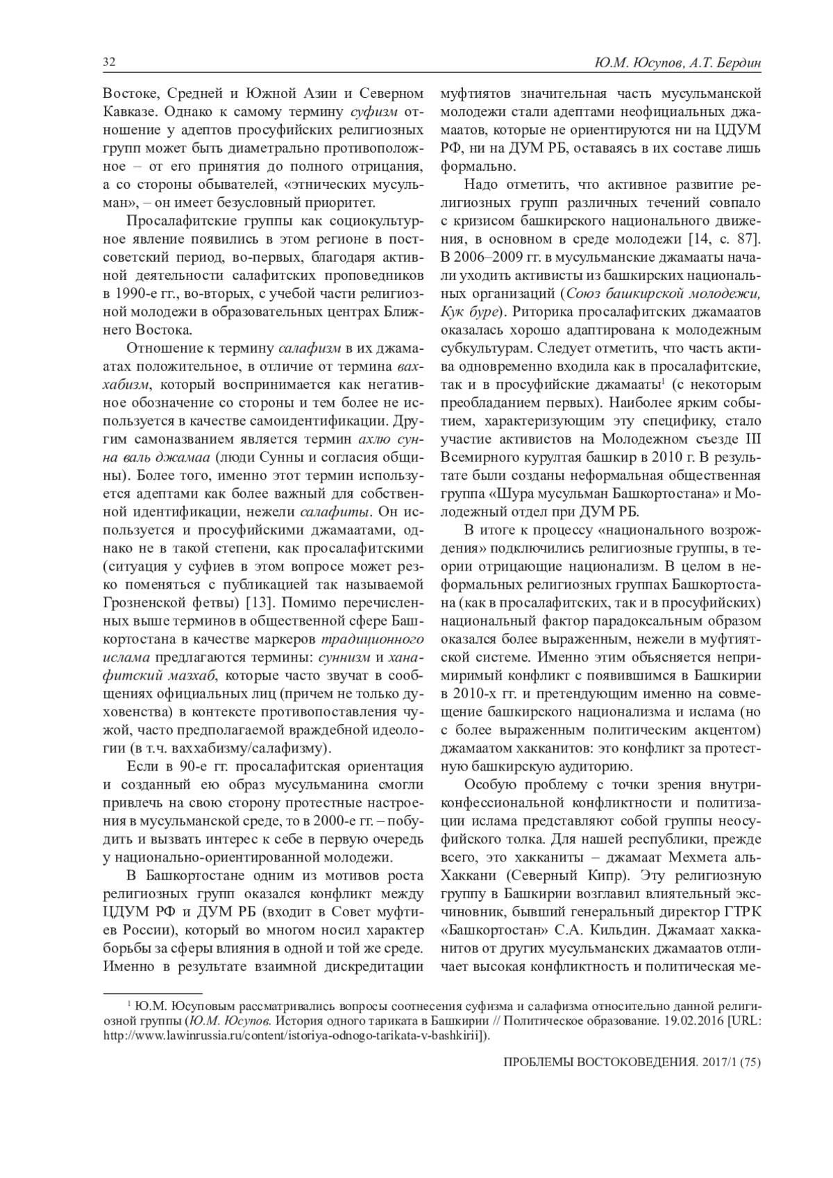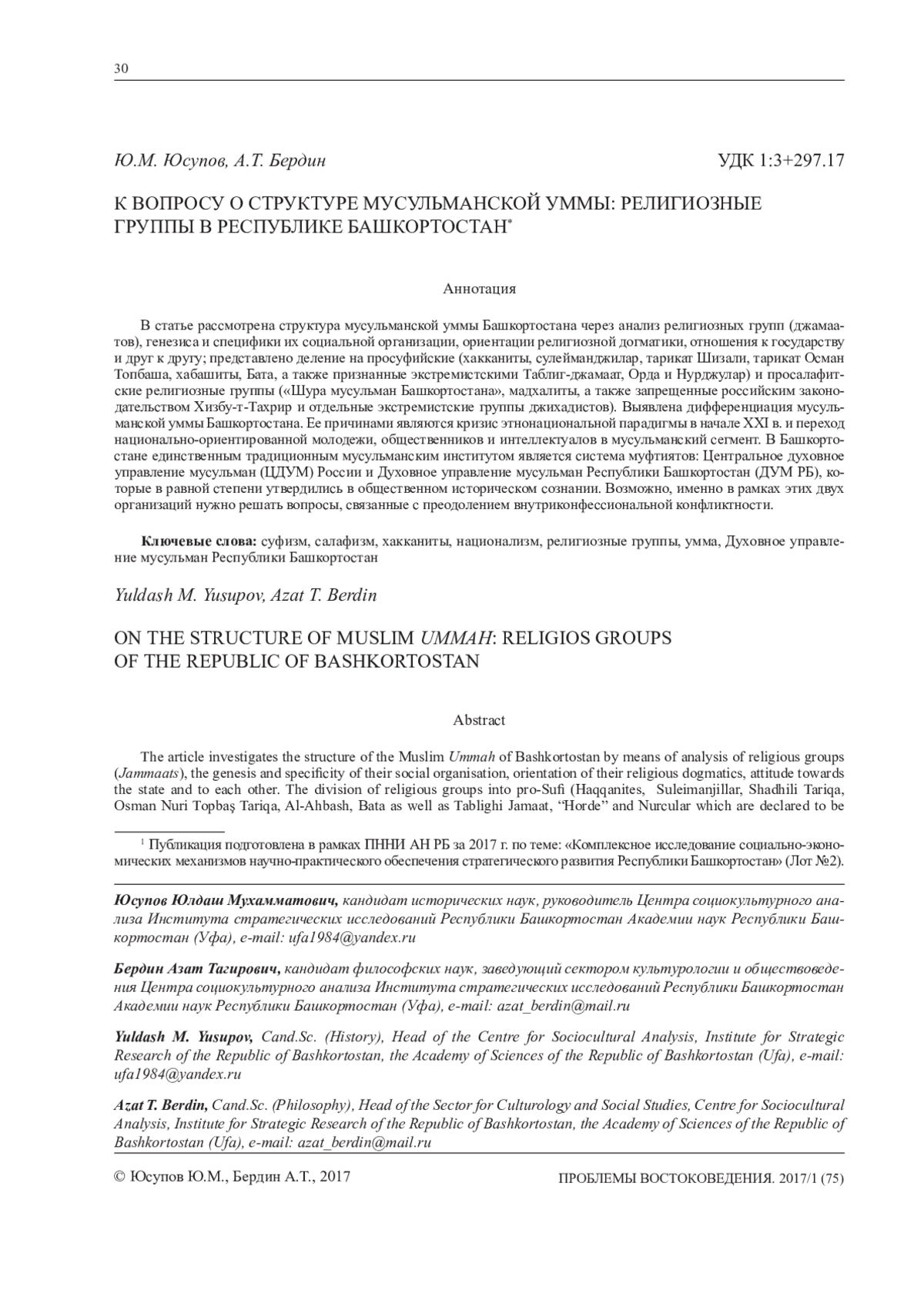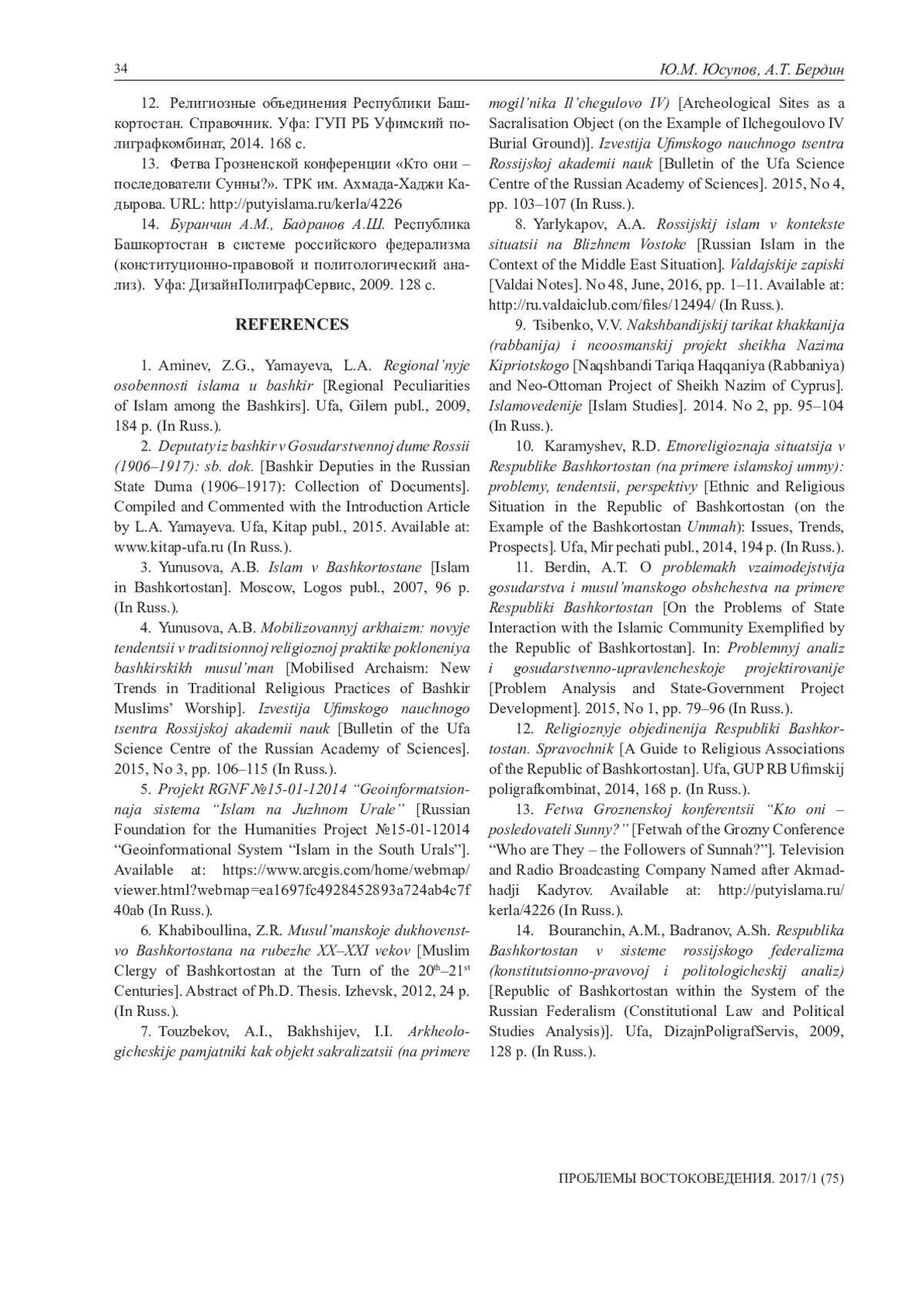 11. Бердин А.Т. О проблемах взаимодействия государства и мусульманского сообщества на примере Республики Башкортостан//Проблемный анализ и государственно-управленческое проектирование. 2015. № 1. С. 79-96. EDN: TUHERH