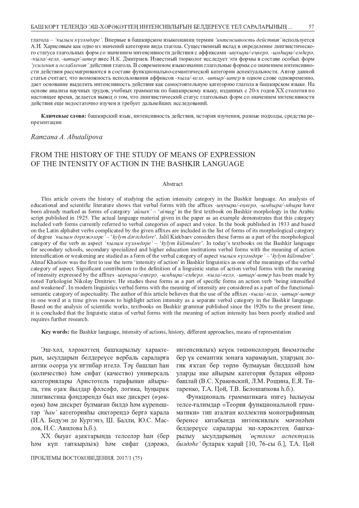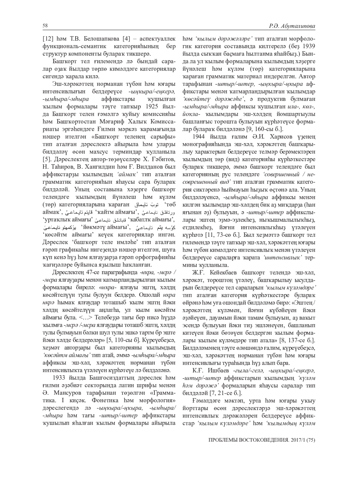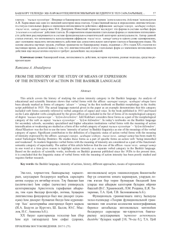 В настоящей статье освещена история изучения категории интенсивности действия в башкирском языке. Анализ учебной и научной литературы показывает, что глагольные формы с аффиксами -ыңҡыра/-еңкерә, -ымhыра/-мhыра отмечены как формы категории ‘аймаҡа’ еще в первом учебнике по морфологии башкирского языка, изданном в 1925 году на основе арабской графики. Приведенный в качестве иллюстрации фактический языковой материал показывает, что в состав данной категории включены формы глагола, относимые в настоящее время к глагольным категориям вида и залога. В учебнике, изданном в 1933 году на основе латинской графики, осложненные данными аффиксами глаголы приводятся в перечне форм морфологической категории его степеней – ‘ҡылым дәрәжәләре’. Дж. Г. Киекбаев рассматривает эти формы в составе морфологической категории вида глагола – ‘ҡылым күләмдәре’. В действующих учебниках по башкирскому языку для средних школ, средних, средне-специальных учебных заведений и вузов глагольные формы со значением усиления и ослабления действия изучаются как формы категории вида глагола – ‘ҡылым күләмдәре’. Впервые в башкирском языкознании термин ‘интенсивность действия’ используется А. И. Харисовым как одно из значений категории вида глагола. Существенный вклад в определение лингвистического статуса глагольных форм со значением интенсивности действия с аффиксами -ыңҡыра/-еңкерә, -ымһыра/-емһерә, -ҡыла/-келә, -штыр/-штер внес Н. К. Дмитриев. Известный тюрколог исследует эти формы в составе особых форм ‘усиления и ослабления’ действия глагола. В современном языкознании глагольные формы со значением интенсивности действия рассматриваются в составе функционально-семантической категории аспектуальности. Автор данной статьи считает, что возможность использования аффиксов -ҡыла/-келә, -штыр/-штер в одном слове одновременно, дает основание выделить интенсивность действия как самостоятельную категорию глагола в башкирском языке. На основе анализа научных трудов, учебных грамматик по башкирскому языку, изданных с 20-х годов ХХ столетия по настоящее время, делается вывод о том, что лингвистический статус глагольных форм со значением интенсивности действия еще недостаточно изучен и требует дальнейших исследований