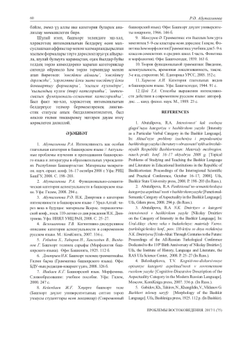 1. Абуталипова Р.А. Интенсивность как особая глагольная категория в башкирском языке//Актуальные проблемы изучения и преподавания башкирского языка и литературы в образовательных учреждениях Республики Башкортостан: Материалы межрегион. науч.-практ. конф. 16-17 октября 2008 г. -Уфа: РИЦ БашГУ, 2008. -С. 198-203. EDN: WIHMTL