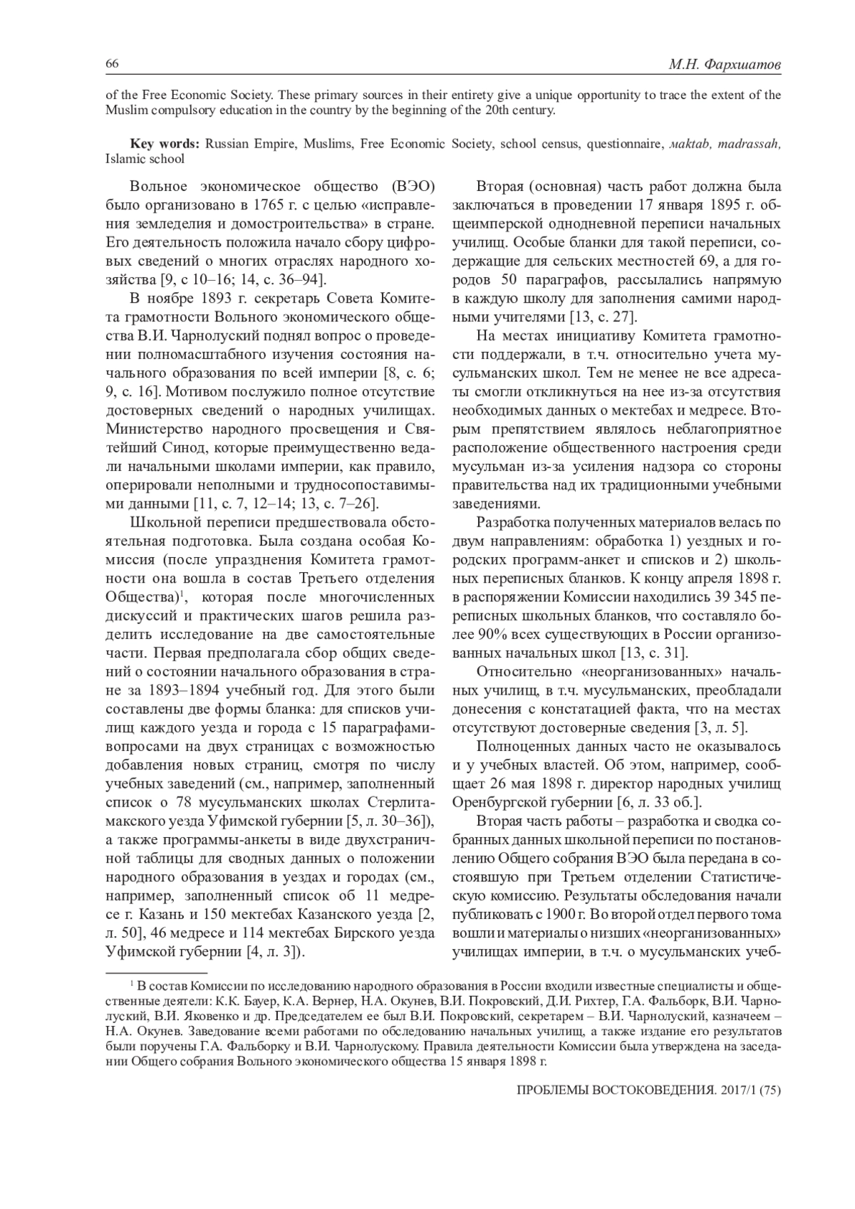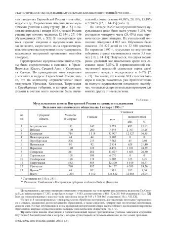 В статье впервые подробно освещаются история проведения Вольным экономическим обществом (ВЭО) на рубеже XIХ–ХХ вв. первого статистического обследования традиционных школ мусульман Внутренней России и основные его результаты. Начальные народные школы, в т. ч. конфессиональные, попали в поле зрения общественности в связи с обсуждением вопроса о введении в стране обязательного всеобщего начального образования (всеобуч). Это потребовало точного знания наличной численности училищ и их доступности для населения. В 1895–1896 гг. Комитет грамотности собрал путем специального анкетирования общие сведения обо всех начальных школах за 1893/1894 учебный год, а также провел 17 января 1895 г. общеимперскую их перепись. Первая часть собранных сведений была обработана и издана, материалы же школьной переписи остались неразработанными и частично сохранились в архиве ВЭО. Эти первоисточники в совокупности дают уникальную возможность проследить масштабы «мусульманского всеобуча» в стране к началу двадцатого столетия