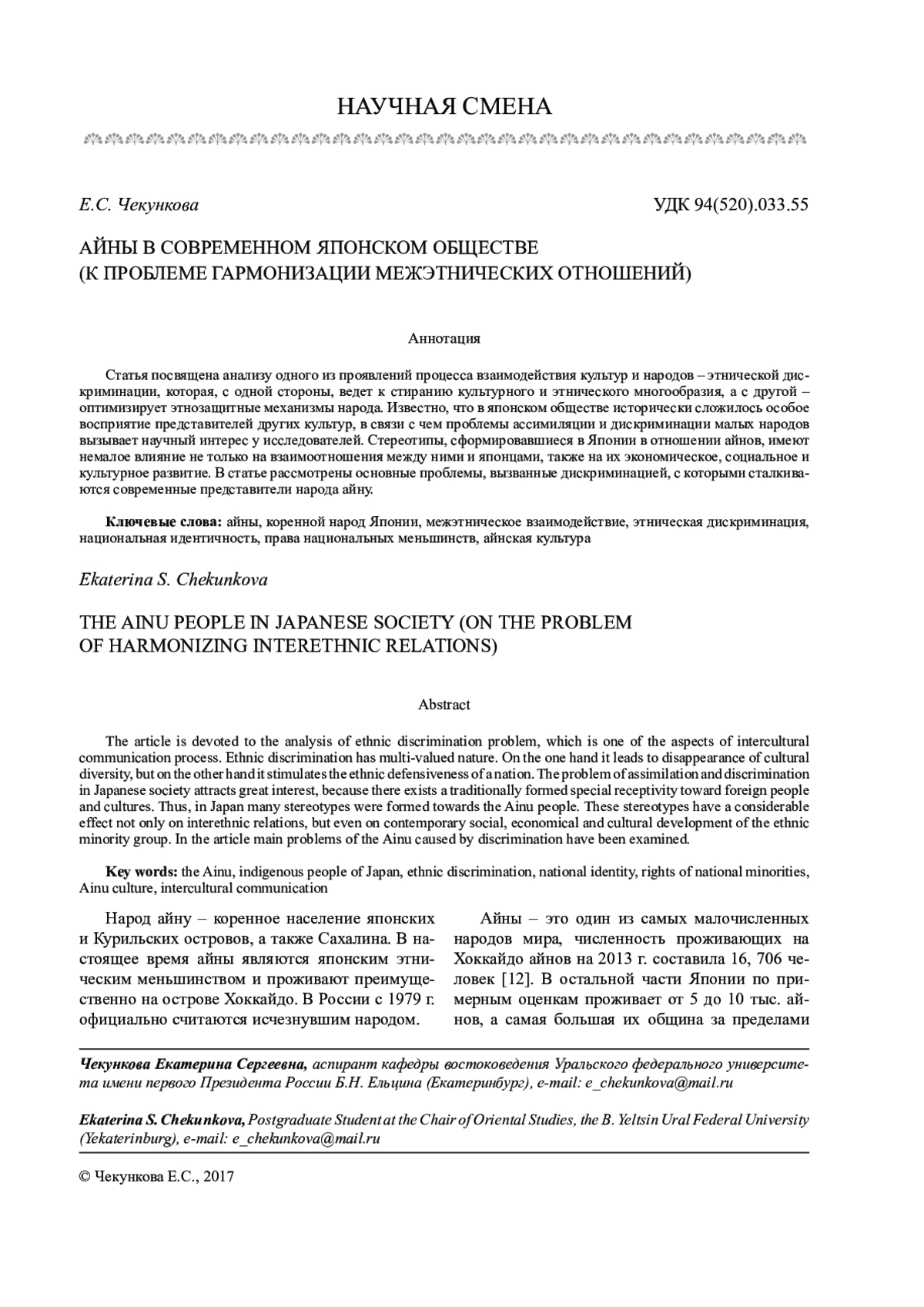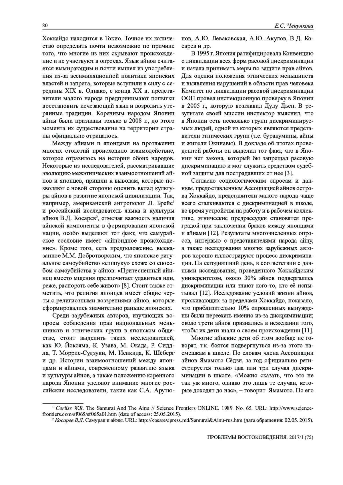 Статья посвящена анализу одного из проявлений процесса взаимодействия культур и народов – этнической дискриминации, которая, с одной стороны, ведет к стиранию культурного и этнического многообразия, а с другой – оптимизирует этнозащитные механизмы народа. Известно, что в японском обществе исторически сложилось особое восприятие представителей других культур, в связи с чем проблемы ассимиляции и дискриминации малых народов вызывает научный интерес у исследователей. Стереотипы, сформировавшиеся в Японии в отношении айнов, имеют немалое влияние не только на взаимоотношения между ними и японцами, также на их экономическое, социальное и культурное развитие. В статье рассмотрены основные проблемы, вызванные дискриминацией, с которыми сталкиваются современные представители народа айну