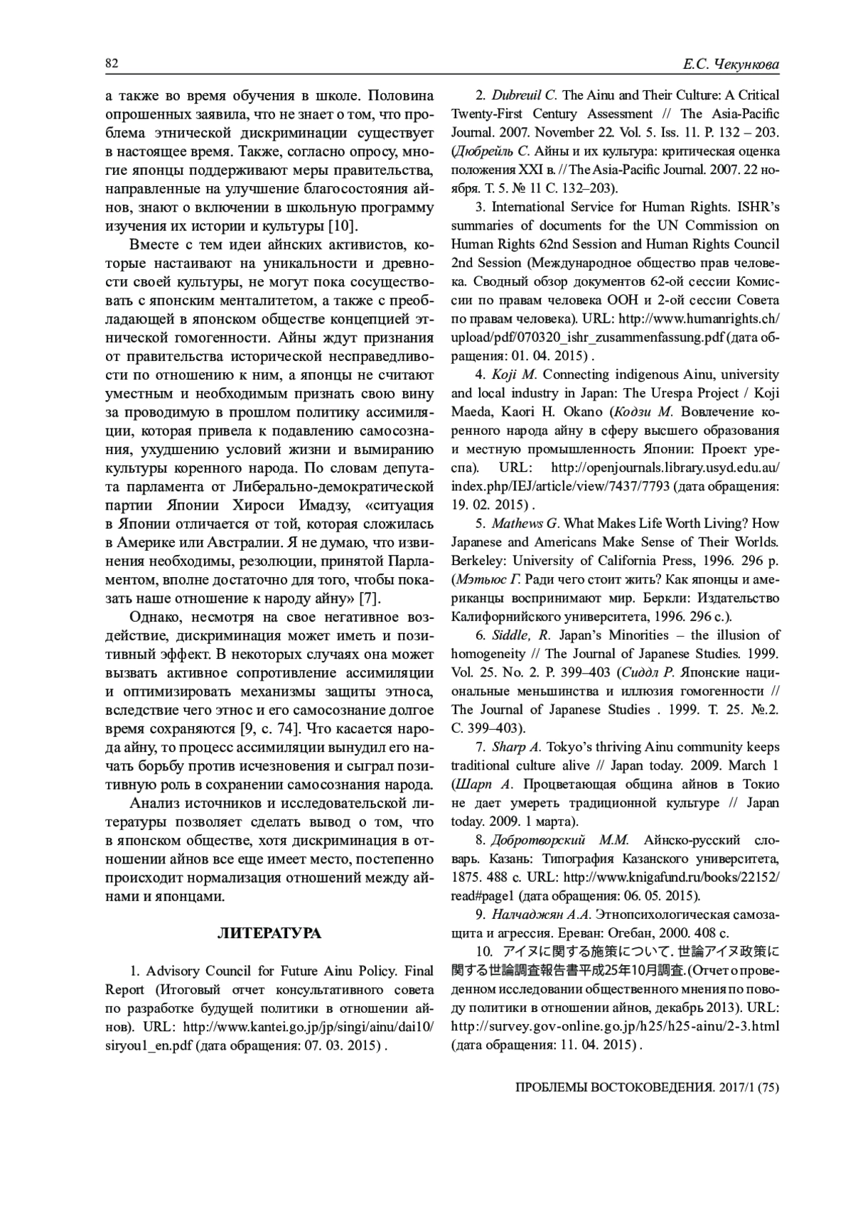 7. Sharp A. Tokyo’s thriving Ainu community keeps traditional culture alive // Japan today. 2009. March 1 (Шарп А. Процветающая община айнов в Токио не дает умереть традиционной культуре // Japan today. 2009. 1 марта).