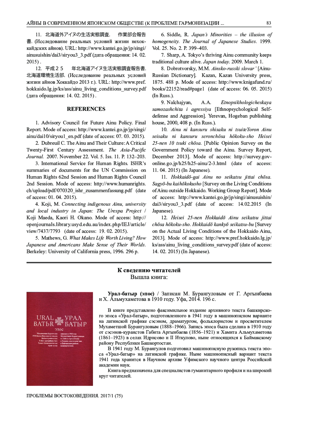 6. Siddle, R. Japan’s Minorities - the illusion of homogeneity // The Journal of Japanese Studies. 1999. Vol. 25. No. 2. P. 399-403 (Сиддл Р. Японские национальные меньшинства и иллюзия гомогенности // The Journal of Japanese Studies. 1999. Т. 25. №. 2. С. 399-403).