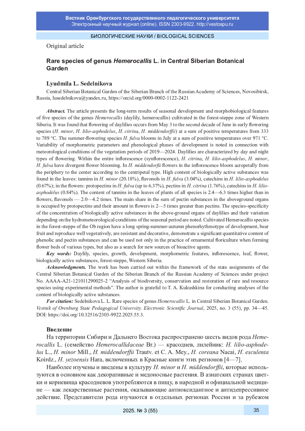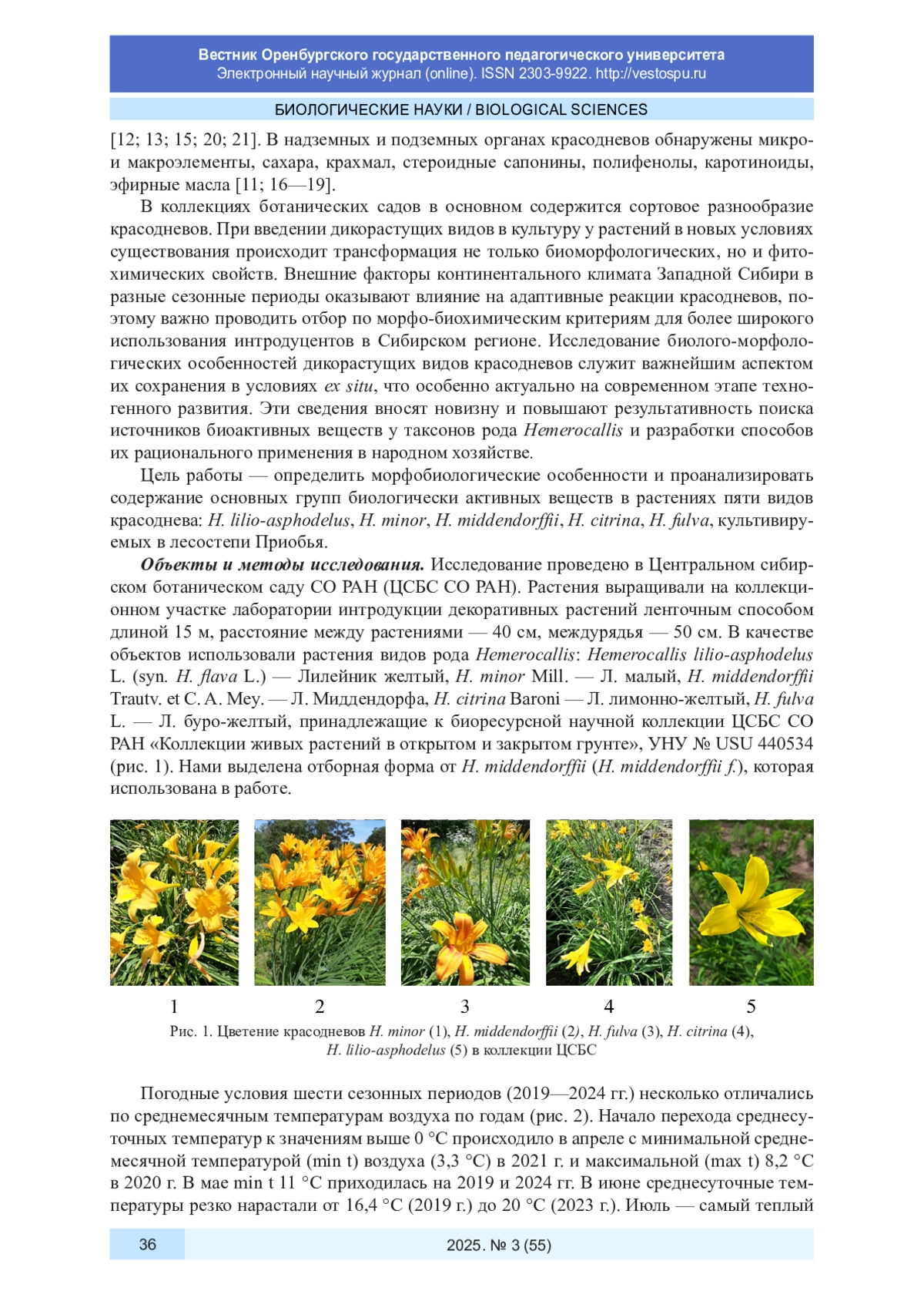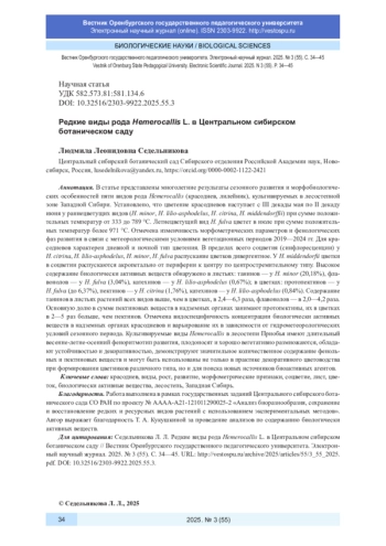 В статье представлены многолетние результаты сезонного развития и морфобиологических особенностей пяти видов рода Hemerocallis (красоднев, лилейник), культивируемых в лесостепной зоне Западной Сибири. Установлено, что цветение красодневов наступает с III декады мая по II декаду июня у раннецветущих видов ( H. minor, H. lilio-asphodelus, H. citrina, H. middendorffii ) при сумме положительных температур от 333 до 789 °С. Летнецветущий вид H. fulva цветет в июле при сумме положительных температур более 971 °С. Отмечена изменчивость морфометрических параметров и фенологических фаз развития в связи с метеорологическими условиями вегетационных периодов 2019-2024 гг. Для красодневов характерен дневной и ночной тип цветения. В пределах всего соцветия (синфлоресценции) у H. citrina, H. lilio-asphodelus, H. minor, H. fulva распускание цветков дивергентное. У H. middendorfii цветки в соцветии распускаются акропетально от периферии к центру по центростремительному типу. Высокое содержание биологически активных веществ обнаружено в листьях: танинов - у H. minor (20,18%), флавонолов - у H. fulva (3,04%), катехинов - у H. lilio-asphodelus (0,67%); в цветках: протопектинов - у H. fulva (до 6,37%), пектинов - у H. citrina (1,76%), катехинов - у H. lilio-asphodelus (0,84%). Содержание танинов в листьях растений всех видов выше, чем в цветках, в 2,4-6,3 раза, флавонолов - в 2,0-4,2 раза. Основную долю в сумме пектиновых веществ в надземных органах занимают протопектины, их в цветках в 2-5 раз больше, чем пектинов. Отмечена видоспецифичность концентрации биологически активных веществ в надземных органах красодневов и варьирование их в зависимости от гидрометеорологических условий сезонного периода. Культивируемые виды Hemerocallis в лесостепи Приобья имеют длительный весенне-летне-осенний феноритмотип развития, плодоносят и хорошо вегетативно размножаются, обладают устойчивостью и декоративностью, демонстрируют значительное количественное содержание фенольных и пектиновых веществ и могут быть использованы не только в практике декоративного цветоводства при формировании цветников различного типа, но и для поиска новых источников биоактивных агентов.