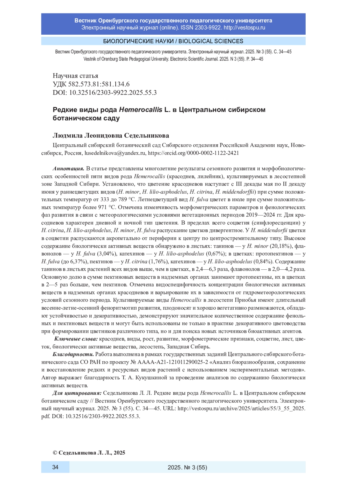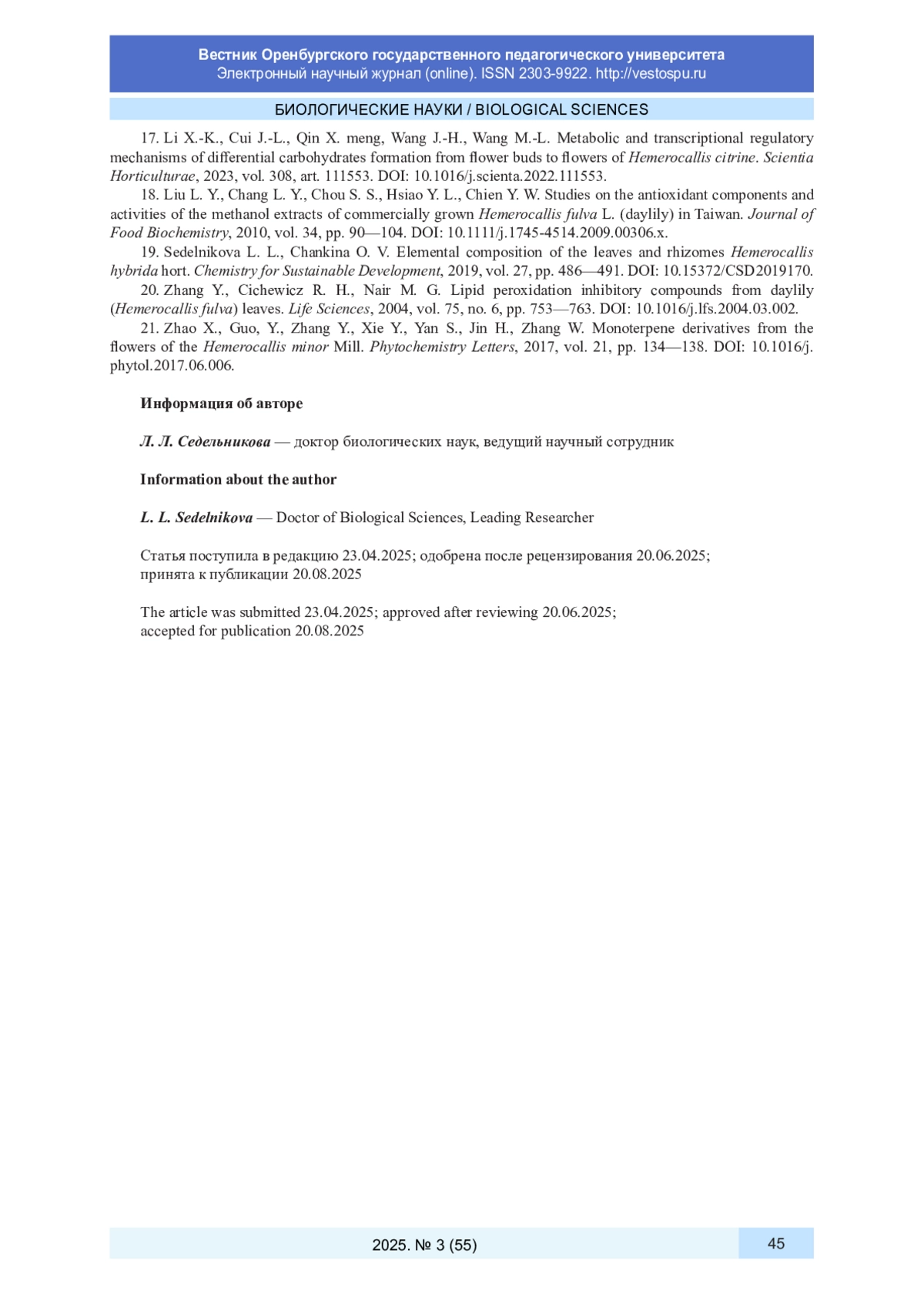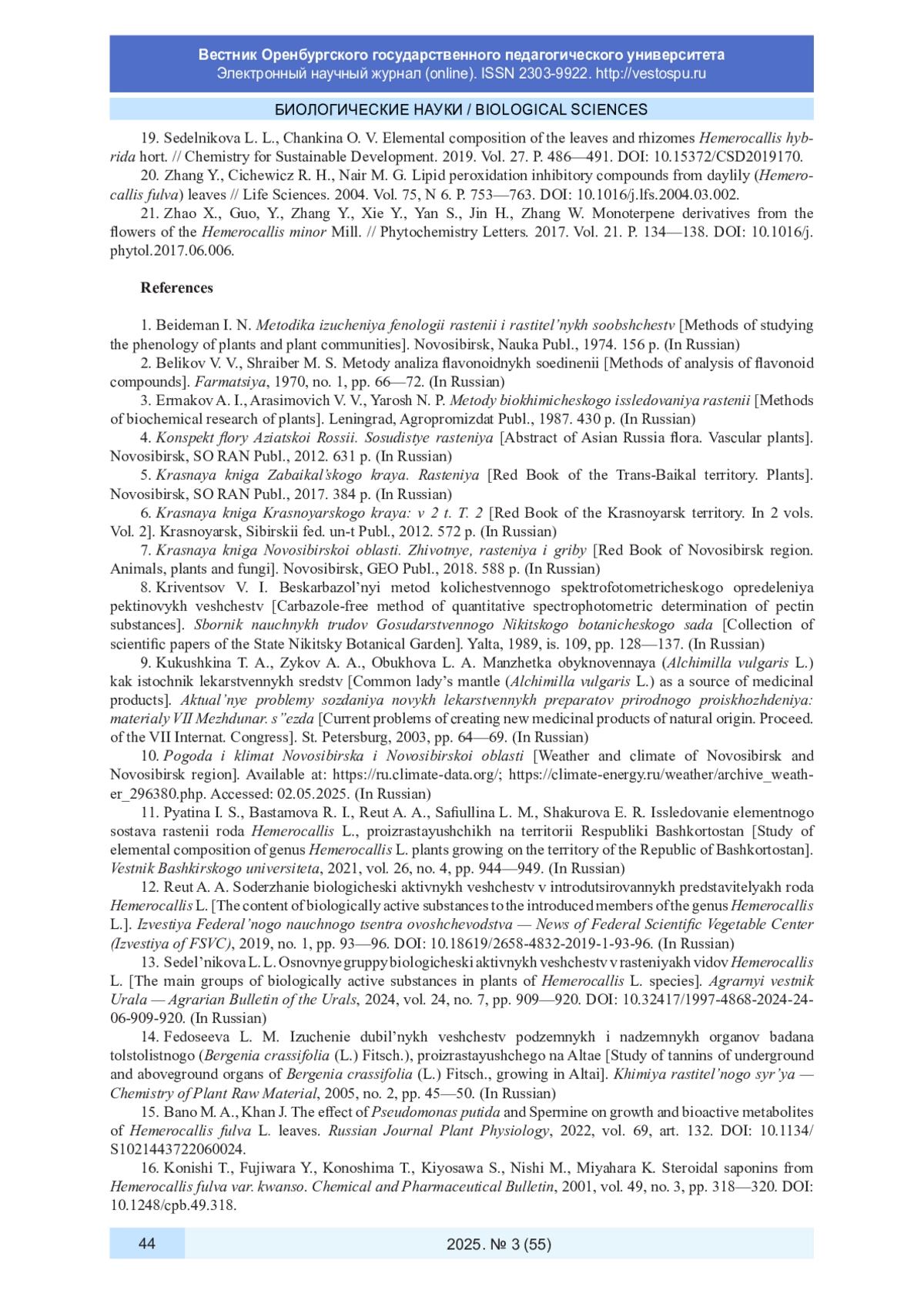 19. Sedelnikova L. L., Chankina O. V. Elemental composition of the leaves and rhizomes Hemerocallis hybrida hort. // Chemistry for Sustainable Development. 2019. Vol. 27. P. 486-491. DOI: 10.15372/CSD2019170