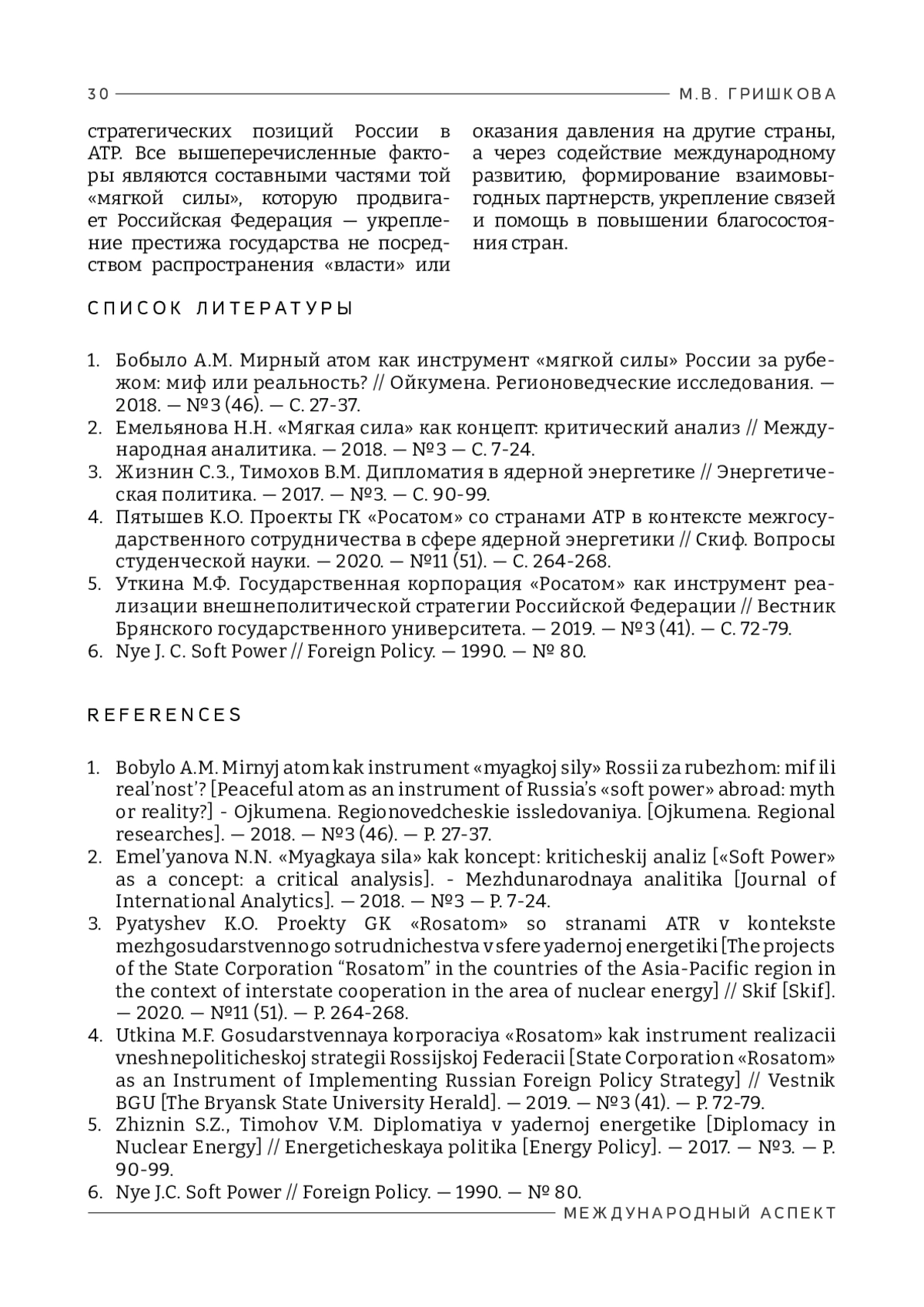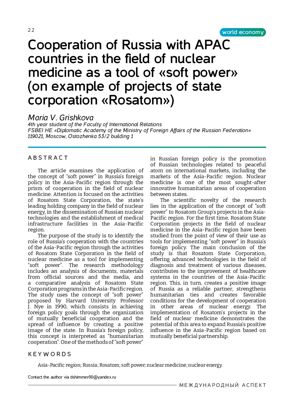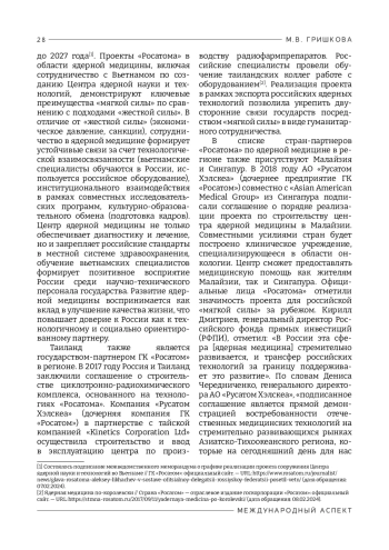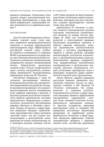 В статье рассматривается применение концепции «мягкой силы» во внешней политике России в Азиатско-Тихоокеанском регионе (АТР) через призму сотрудничества в сфере ядерной медицины. Акцентируется внимание на деятельности ГК «Росатом», ведущего холдинга государства в сфере атомной энергетики, по распространению российских ядерных технологий и созданию объектов медицинской инфраструктуры в странах Азиатско-Тихоокеанского региона. Цель работы – выявить роль сотрудничества России со странами АТР через деятельность ГК «Росатом» в сфере ядерной медицины как инструмента реализации «мягкой силы» государства. Методология исследования включает в себя анализ документов, материалов из официальных источников и СМИ, сравнительный анализ программ ГК «Росатом» в странах АТР. В рамках исследования была использована концепция «мягкой силы», предложенная профессором Гарвардского университета Дж. Наем в 1990 г. и заключающаяся в достижении внешнеполитических целей через организацию взаимовыгодного сотрудничества и распространение влияния за счет создания позитивного имиджа государства. Во внешней политике России эта концепция интерпретируется как «гуманитарное сотрудничество». Одним из методов «мягкой силы» в российской внешней политике является продвижение российских технологий, связанных с мирным атомом, на международные рынки, в том числе рынки стран АТР. Ядерная медицина является одним из востребованных инновационных гуманитарных направлений сотрудничества государств. Научная новизна исследования заключается в применении концепции «мягкой силы» Дж. Ная к проектам ГК «Росатом» в Азиатско-Тихоокеанском регионе. Впервые проведено исследование проектов ГК «Росатом» в сфере ядерной медицины в странах АТР с точки зрения их использования в качестве инструментов реализации «мягкой силы» во внешней политике России. Главный вывод исследования заключается в том, что ГК «Росатом», предлагая передовые технологии в сфере диагностики и лечения различных заболеваний, способствует улучшению систем здравоохранения в странах Азиатско-Тихоокеанского региона. Это, в свою очередь, формирует положительный имидж России как надежного партнера, укрепляет гуманитарные связи и создает благоприятную почву для развития сотрудничества в других областях атомной энергетики. Реализация проектов «Росатома» в сфере ядерной медицины демонстрирует потенциал данного направления для расширения позитивного влияния России в АТР с опорой на взаимовыгодное партнерство.