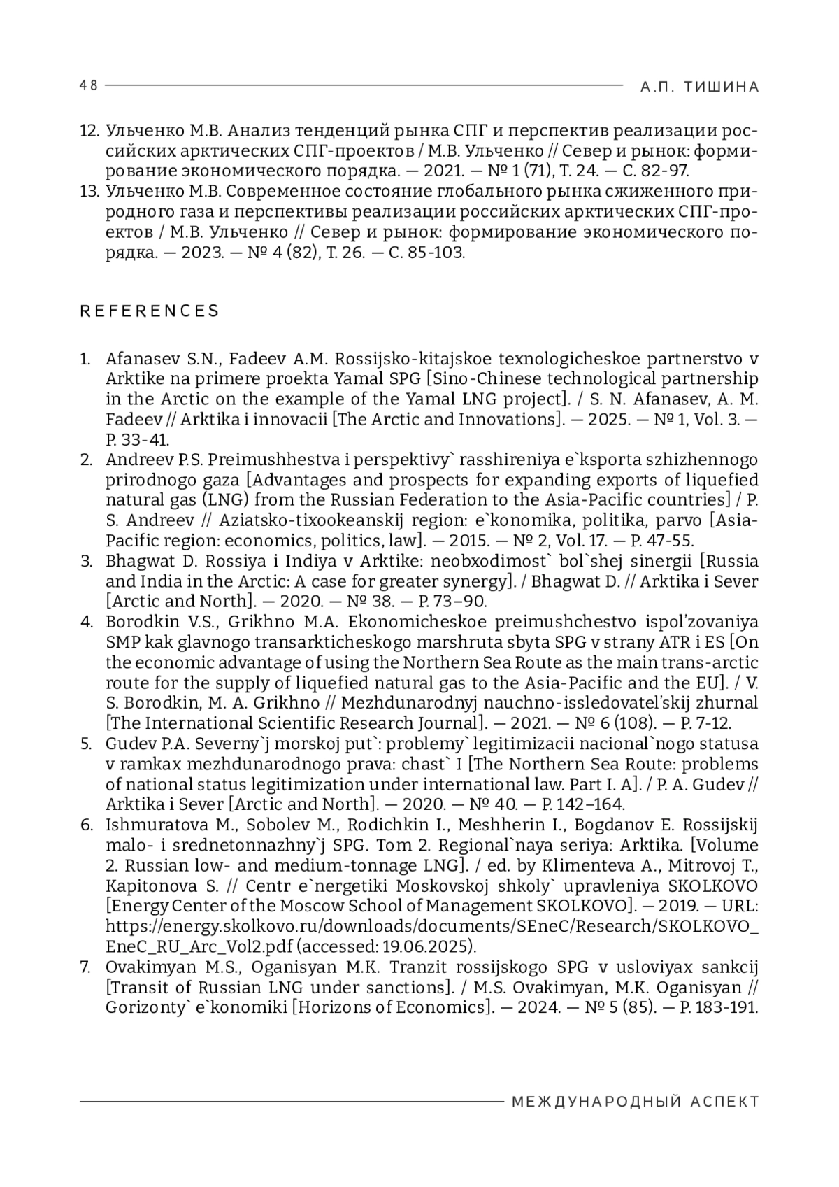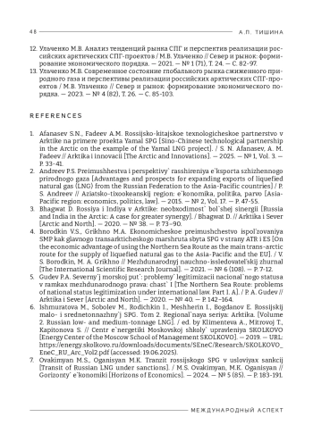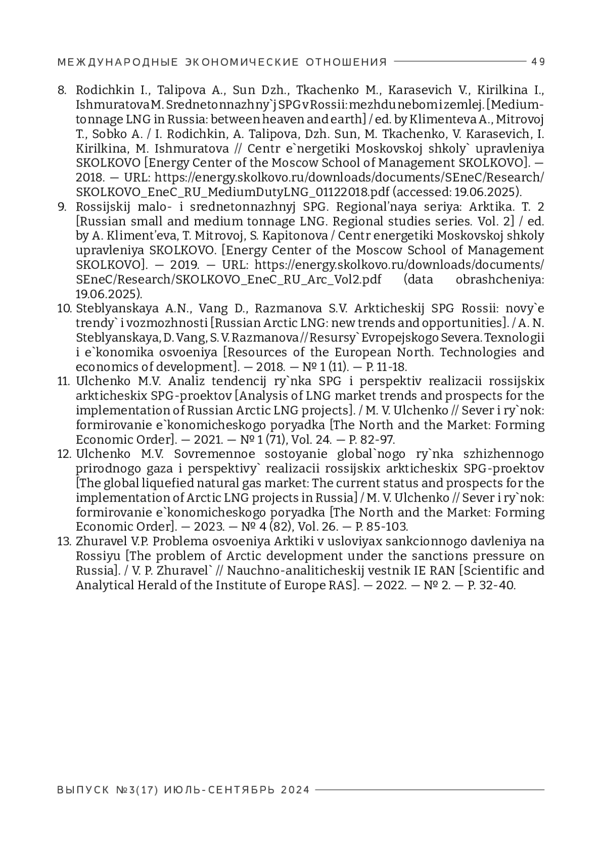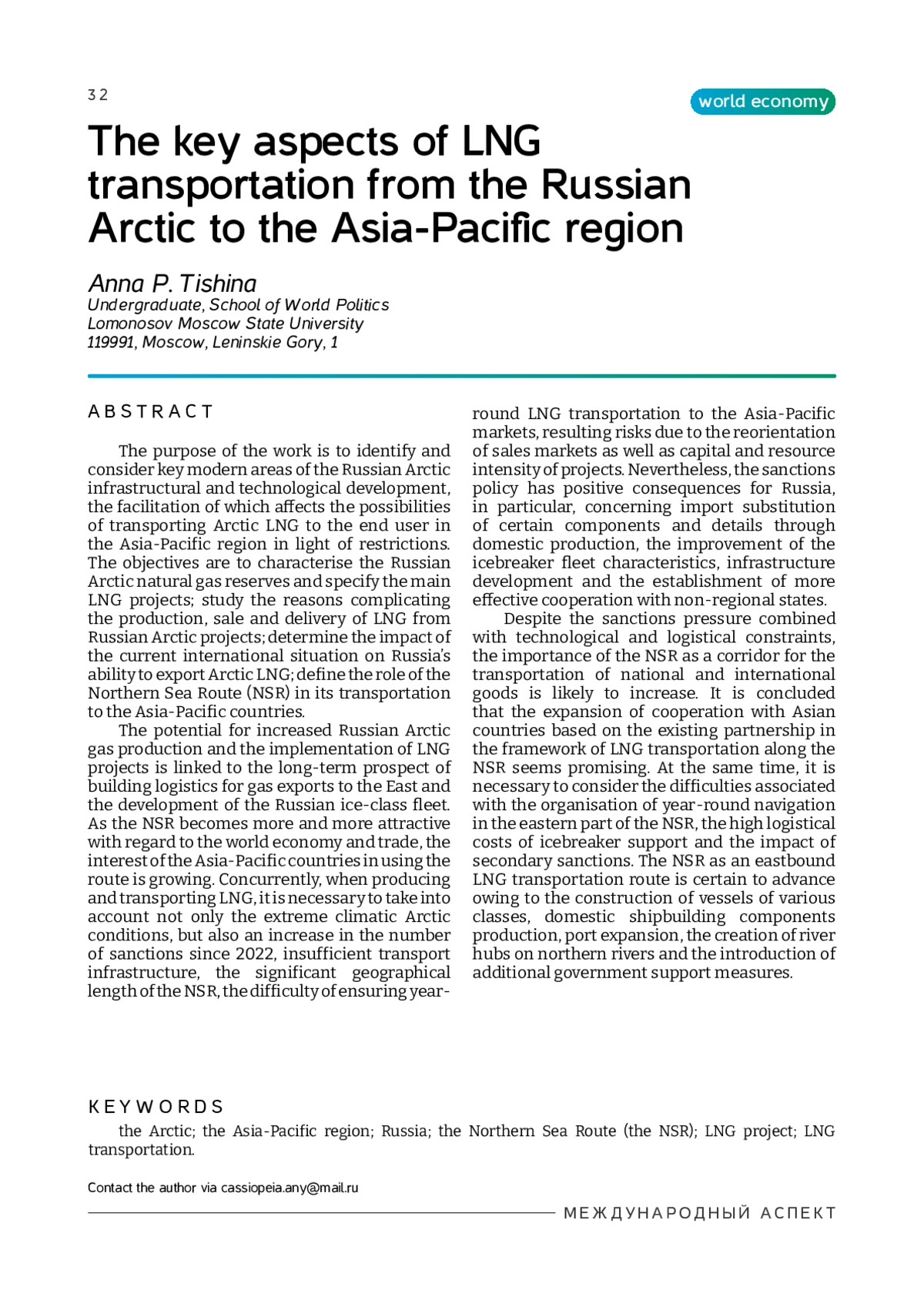 Цель работы заключается в выявлении и рассмотрении ключевых современных областей инфраструктурного и технологического развития российской Арктики, продвижение которых влияет на возможности перевозки арктического СПГ конечному потребителю в АТР в условиях ограничений. Поставлены задачи охарактеризовать российские арктические за пасы природного газа и выделить основные СПГ-проекты; рассмотреть причины, осложняющие производство, реализацию и доставку СПГ с российских арктических проектов; определить влияние современной международной обстановки на возможности России осуществлять экспорт арктического СПГ, охарактеризовать роль Северного морского пути (СМП) в его транспортировке в страны АТР. Потенциал увеличения российского арктического газа и реализации СПГ-проектов связан с долгосрочной перспективой выстраивания логистики экспорта газа на Восток, развитием российского флота ледового класса. Поскольку СМП становится все более привлекательным с точки зрения мировой экономики и торгов ли, интерес стран АТР к использованию пути растет. При этом при производстве и транспортировке СПГ необходимо учитывать не только экстремальные природно-климатические арктические условия, но и увеличение числа санкций с 2022 года, недостаточность транспортной инфраструктуры, значительную географическую протяженность маршрута СМП, сложность обеспечения круглогодичной транспортировки СПГ на рынки АТР, риски из-за переориентации рынков сбыта, капитало- и ресурсоемкость проектов. Тем не менее санкционная поли тика имеет положительные последствия для России, в частности, в вопросе импортозамещения некоторых компонентов и дета лей с помощью отечественных производств, улучшения характеристик ледокольного флота и развития инфраструктуры, налаживания более эффективного сотрудничества с внерегиональными государствами. добычи Несмотря на санкционное давление, технологические и логистические ограничения, значение СМП как коридора для перевозки национальных и международных грузов будет возрастать. Сделан вывод о перспективности расширения взаимодействия с азиатскими странами на основе существующего партнерства в рамках транспортировки СПГ по СМП. При этом необходимо учитывать трудности, связанные с организацией круглогодичной навигации в морях восточной части акватории СМП, высокие логистические затраты на ледокольную проводку и влияние вторичных санкций. Продвижению СМП как марш рута перевозки СПГ в восточном направлении будет способствовать строительство судов различного класса, налаживание производства отечественных судостроительных компонентов, расширение портов, создание речных хабов на северных реках, внедрение дополнительных мер государственной поддержки.
