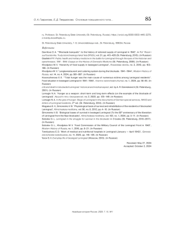 2. Гаврилова О. А. “Блокадные банкеты”: к истории нормированного снабжения Ленинграда в 1942 г. // Путь России и судьба историка. СПб., 2015. (Труды исторического факультета СПбГУ; вып. 21). С. 415-420.