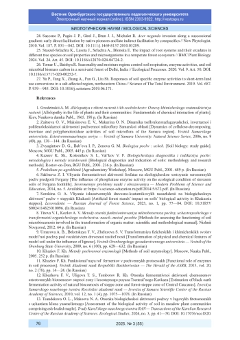 2. Зайцева О. В., Максимова Е. В., Макурина О. Н. Динамика целлюлозоразлагающей, инвертазной и полифенолоксидазной активностей почвенной микрофлоры Самарской области // Вестник Самарского университета. Естественнонаучная серия. 2006. № 9 (49). С. 138-144. EDN: HZZZXT