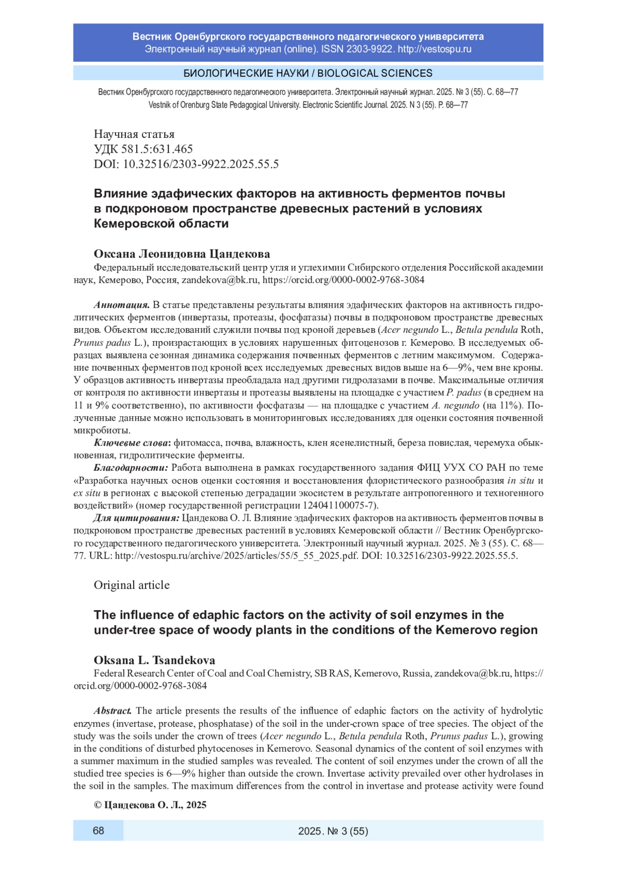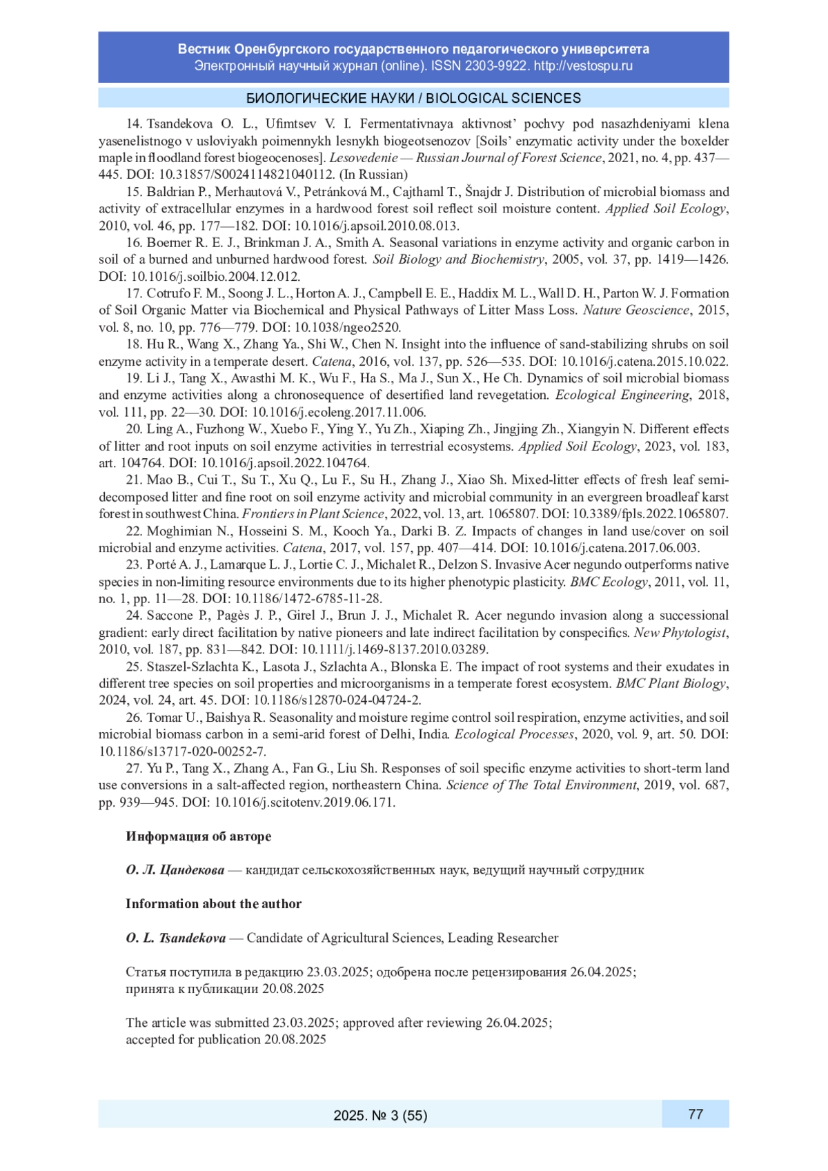 14. Цандекова О. Л., Уфимцев В. И. Ферментативная активность почвы под насаждениями клена ясенелистного в условиях пойменных лесных биогеоценозов // Лесоведение. 2021. № 4. С. 437-445. DOI: 10.31857/S0024114821040112 EDN: WOMAIX