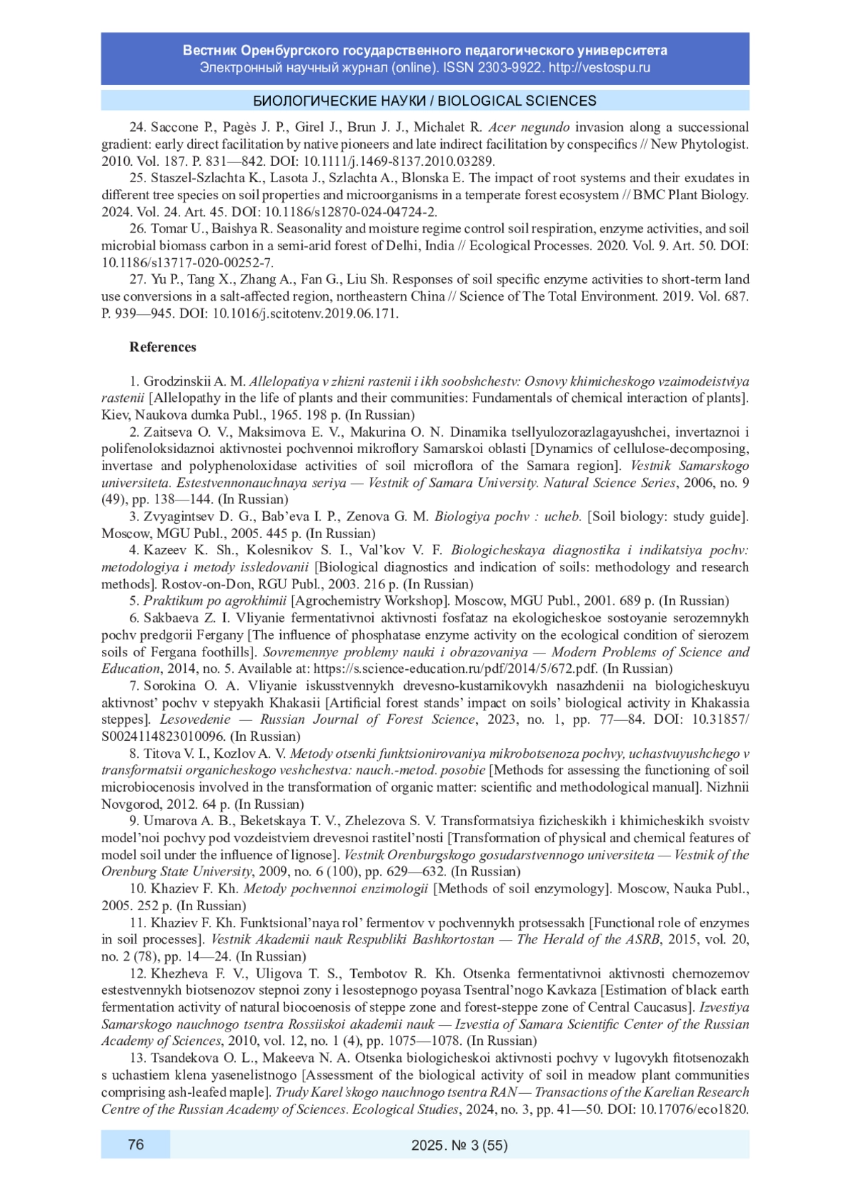 27. Yu P., Tang X., Zhang A., Fan G., Liu Sh. Responses of soil specific enzyme activities to short-term land use conversions in a salt-affected region, northeastern China // Science of The Total Environment. 2019. Vol. 687. P. 939-945. DOI: 10.1016/j.scitotenv.2019.06.171