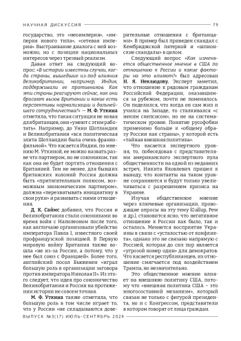 Панельная дискуссия Англосаксонского клуба НСО МГИМО, состоявшаяся 25 апреля 2025 года, под названием «300 лет противостояния: как строить отношения с англосаксами», стала важной площадкой для всестороннего анализа многолетнего противостояния и современных вызовов в российско-англосаксонских отношениях. Обсуждались вопросы международной безопасности, дипломатии, санкций, а также стратегического партнерства и многополярности в условиях современного международного кризиса, с особым акцентом на российско- американские и российско-британские связи. В ходе обсуждения эксперты рассмотрели влияние российского фактора на внутриполитическую повестку США и Великобритании, включая санкционное давление, шпионские скандалы и украинский кризис, которые существенно осложняют диалог и требуют новых дипломатических подходов. Анализировались текущие тенденции в международной дипломатии, вопросы ядерного разоружения, роль НАТО и перспективы много полярности в современном мире. Особое внимание было уделено роли Канады, где украинская диаспора оказывает значительное влияние на внутреннюю и внешнюю политику, что осложняет двусторонние отношения с Россией. Важной частью дискуссии стал анализ российско-британских отношений, отмеченных цикличностью, шпионски ми скандалами, санкционной политикой и влиянием постимперских и ирландских факторов, в том числе через призму Белфастского соглашения и Brexit. Участники подчеркнули, что Великобритания выступает идейным архитектором антироссийского консенсуса, активно поддерживая санкции, военное сотрудничество с Украиной и формируя негативный нарратив о «российской угрозе» в рамках ЕС и НАТО. В то же время экс перты отметили скрытую конкуренцию между США и Великобританией за лидерство в антироссийской повестке, а также подчеркнули необходимость прагматичного подхода и трезвого реализма в выстраивании отношений с Лондоном. Обсуждалась также роль бывших британских колоний, таких как Индия, в современной мировой политике и их отношение к России как потенциальному экономическому и стратегическому партнеру. Эксперты отметили, что Россия должна активно использовать возможности для расширения сотрудничества с этими странами. Особое внимание было уделено влиянию общественного мнения в США на формирование внешней политики, поддержке санкций и восприятию России как ключевого соперника. Было отмечено, что общественное мнение оказывает значительное влияние на решения Конгресса и администрации, а также на перспективы отмены или сохранения санкций. В заключительной части дискуссии были рассмотрены перспективы развития НАТО, его внутренние противоречия и влияние на архитектуру европейской и глобальной безопасности, включая тему узурпаторства в Европе. Эксперты сошлись во мнении, что будущее альянса во многом зависит от трансформации внешнеполитических приоритетов США и консенсуса среди стран-участников по вопросу России. Изучение опыта стран спустя столетия позволяет глубже понять приоритеты и принципы российско-американских и российско-британских отношений, учесть успешные и неудачные дипломатические шаги, а также выявить факторы, определяющие уровень международных отношений между государствами с различными интересами. Проведение дискуссии способствовало углублению пони