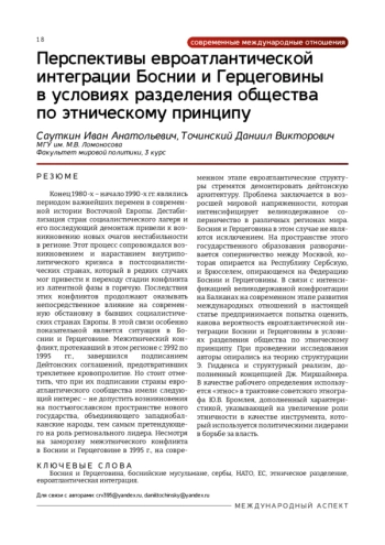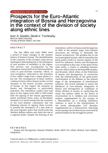 Конец 1980-х – начало 1990-х гг. являлись периодом важнейших перемен в современной истории Восточной Европы. Дестабилизация стран социалистического лагеря и его последующий демонтаж привели к возникновению новых очагов нестабильности в регионе. Этот процесс сопровождался возникновением и нарастанием внутриполитического кризиса в постсоциалистических странах, который в редких случаях мог привести к переходу стадии конфликта из латентной фазы в горячую. Последствия этих конфликтов продолжают оказывать непосредственное влияние на современную обстановку в бывших социалистических странах Европы. В этой связи особенно показательной является ситуация в Боснии и Герцеговине. Межэтнический конфликт, протекавший в этом регионе с 1992 по 1995 гг., завершился подписанием Дейтонских соглашений, предотвративших трехлетнее кровопролитие. Но стоит отметить, что при их подписании страны евро атлантического сообщества имели следующий интерес – не допустить возникновения на постъюгославском пространстве нового государства, объединяющего западнобалканские народы, тем самым претендующего на роль регионального лидера. Несмотря на заморозку межэтнического конфликта в Боснии и Герцеговине в 1995 г., на современном этапе евроатлантические структуры стремятся демонтировать дейтонскую архитектуру. Проблема заключается в воз росшей мировой напряженности, которая интенсифицирует великодержавное соперничество в различных регионах мира. Босния и Герцеговина в этом случае не являются исключением. На пространстве этого государственного образования разворачивается соперничество между Москвой, которая опирается на Республику Сербскую, и Брюсселем, опирающемся на Федерацию Боснии и Герцеговины. В связи с интенсификацией великодержавной конфронтации на Балканах на современном этапе развития международных отношений в настоящей статье предпринимается попытка оценить, какова вероятность евроатлантической интеграции Боснии и Герцеговины в условиях разделения общества по этническому принципу. При проведении исследования авторы опирались на теорию структурации Э. Гидденса и структурный реализм, до полненный концепцией Дж. Миршаймера. В качестве рабочего определения используется «этнос» в трактовке советского этнографа Ю. В. Бромлея, дополненный характеристикой, указывающей на увеличение роли этничности в качестве инструмента, который используется политическими лидерами в борьбе за власть.