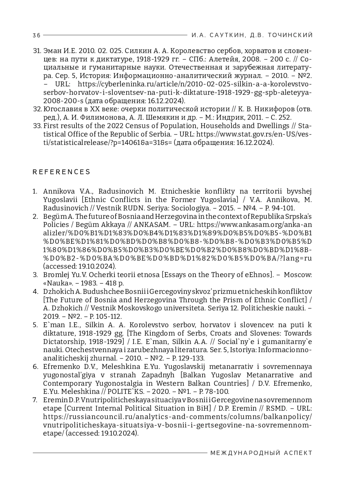 22. Понамарева А.М. Евроинтеграция как триггер сербского этносепаратизма в Боснии и Герцеговине // Вестник Московского университета. Серия 25. Международные отношения и мировая политика. - 2021. - №1. - URL: https://cyberleninka.ru/article/n/evrointegratsiya-kak-trigger-serbskogoetnoseparatizma-v-bosnii-i-gertsegovine (дата обращения: 19.10.2024).