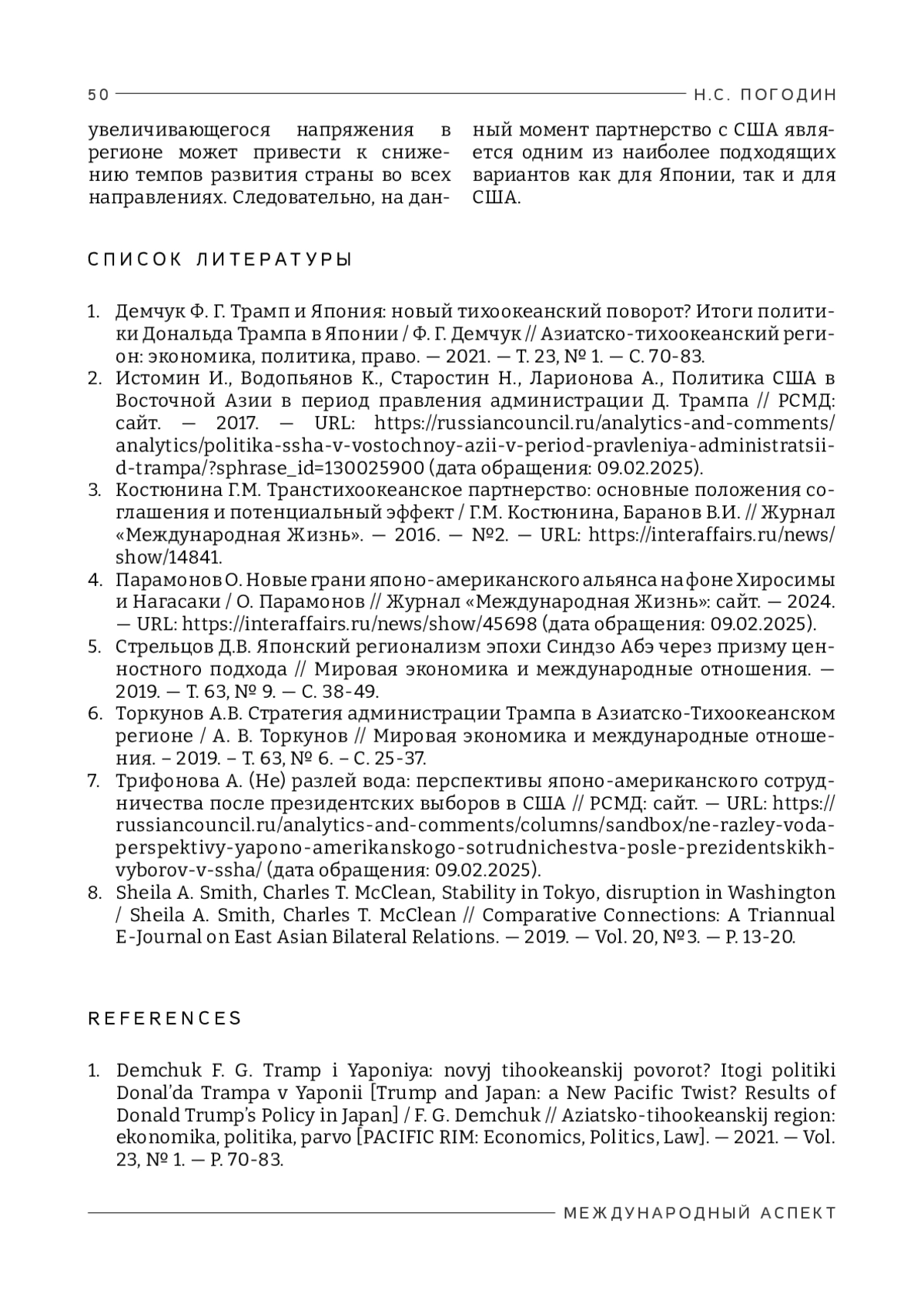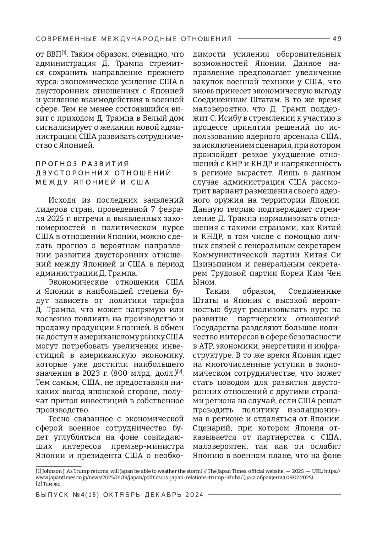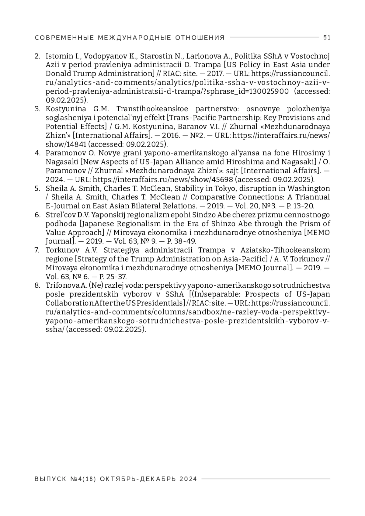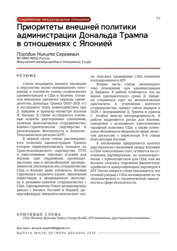 Статья посвящена анализу эволюции и перспектив японо-американских отношений в контексте смены политических администраций в США и Японии. Основное внимание уделяется периоду президентства Дональда Трампа (2017–2021 гг.) и последнему этапу взаимодействия при Д. Байдене и премьер-министре Японии Ф. Кисида. В статье исследуются ключе вые аспекты двусторонних отношений, включая экономическое сотрудничество, военно-стратегическое партнерство и региональную безопасность в Азиатско- Тихоокеанском регионе (АТР). В первой части статьи рассматривается политика администрации Трампа, которая характеризовалась выходом из Транстихоокеанского партнерства (ТТП) и ужесточением торговых условий для Японии при сохранении протекционистских мер в автомобильной промышленности. Несмотря на это, сотрудничество США и Японии даже усилилось: Япония стремилась сохранить альянс, увеличивая инвестиции в американскую экономику и развивая военное сотрудничество с США. Одновременно Токио активизировал диалог с Китаем, Россией и Индией, диверсифицируя внешнеполитические связи, опасаясь проведения США политики изоляционизма в АТР. Вторая часть статьи анализирует этап отношений при администрации Д. Байдена. В работе отмечается, что во время президентского срока Д. Байде на сохранился курс на экономический прагматизм и углубление военного сотрудничества, однако смена лидеров в 2024 г. (возвращение Д. Трампа и приход С. Исибы) внесла неопределенность. В работе выделяются риски для Японии, связанные с возможным ужесточением тарифной политики США, а также потенциал сближения в оборонной сфере, включая дискуссии о пересмотре 9-й статьи Конституции Японии. В заключении предлагается прогноз двусторонних отношений между Японией и США относительно того, останутся ли от ношения партнерскими, но асимметричными, с преимуществом для США, или же Япония, опасаясь отдаления Вашингтона, прибегнет к диверсификации партнеров в АТР. Тем не менее в статье указывается, что полный разрыв с США маловероятен из-за экономической и стратегической зависимости в сфере безопасности.