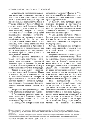 Объект исследования – противостояние концепций Большого Ирана и Великого Турана в идеологическом и внешнеполитическом измерении стратегий Ирана и Турции на Южном Кавказе; предмет – историко-культурные факторы, обусловившие формирование и развитие данного противостояния.