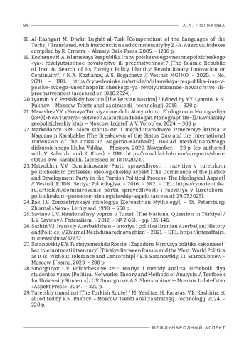 2. Аватков В.А., Касьяненко А.В. Военно-политические отношения на Южном Кавказе в контексте треугольника «Россия-Турция-Иран» // Мировая политика. - 2021. - №3. - URL: https://cyberleninka.ru/article/n/voenno-politicheskieotnosheniya-na-yuzhnom-kavkaze-v-kontekste-treugolnika-rossiya-turtsiyairan (дата обращения: 19.10.2024).