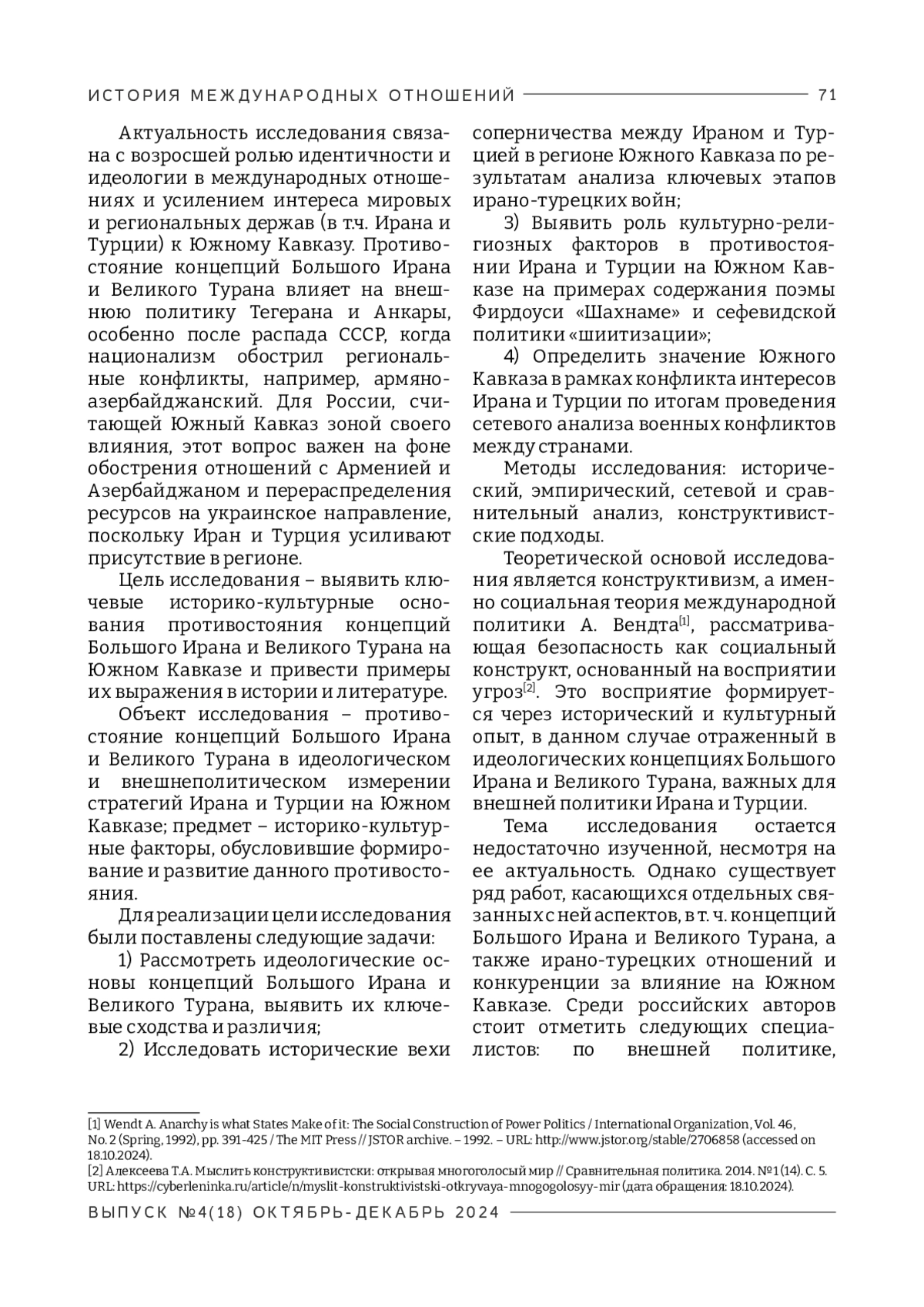 В статье рассматриваются историко-культурные основания идеологического противостояния концепций Большого Ирана и Великого Турана и их влияние на внешнюю политику Ирана и Турции на Южном Кавказе. В силу ограничений формата научной статьи исследование не претендует на полное освещение тысяче летней эволюции указанных концепций, а сосредотачивается на ключевых исторических вехах данного процесса. В исследовании, основанном на историческом, сетевом и сравнительном анализе, а также конструктивистских подходах, рассматриваются культурно-религиозные различия как факторы указанного противостояния и историческая динамика ирано-турецких войн. Особое внимание уделено инструментализации паниранизма и пантюркизма, а также стратегическому значению региона. Ирано-турецкие войны как часть противостояния Ирана и Турции рассматриваются через сетевой анализ, где Южный Кавказ – ключевой узел с высокой центральностью и плотностью конфликтов. Локальные и глобальные коэффициенты кластеризации показывают взаимосвязанность зон боевых действий и наличие треугольной области соперничества. Сравнительный анализ концепций Большого Ирана и Великого Турана выявляет различия в идеологических и стратегических подходах Ирана и Турции к региональному доминированию. Не являясь официальными стратегическими документами, концепции Большого Ирана и Великого Турана выступают идеологическим обоснованием внешнеполитических приоритетов Ирана и Турции на Южном Кавказе. Иран опирается на куль турно-цивилизационное наследие, в то время как Турция реализует более политизированную стратегию, ориентированную на этническую общность. Противостояние также усиливается религиозными различиями и сталкивающимися экономическими интересами. Результаты исследования показывают, что современное соперничество Ирана и Турции на Южном Кавказе продолжает исторические тренды и сохраняет свою актуальность для обоих государств с точки зрения идеологии, национальной безопасности и экономических интересов.