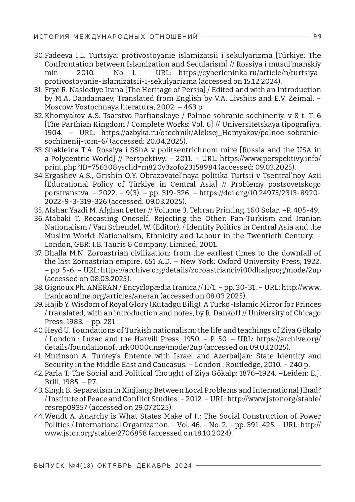 34. Эргашев А.С., Гришин О.Е. Образовательная политика Турции в Центральной Азии. Проблемы постсоветского пространства. - 2022. - 9(3). - С.19-326. https://doitps://doi.org/doi.org/10.24975/2313-8920-2022-9-3-319-326 (дата обращения: 09.03.2025).