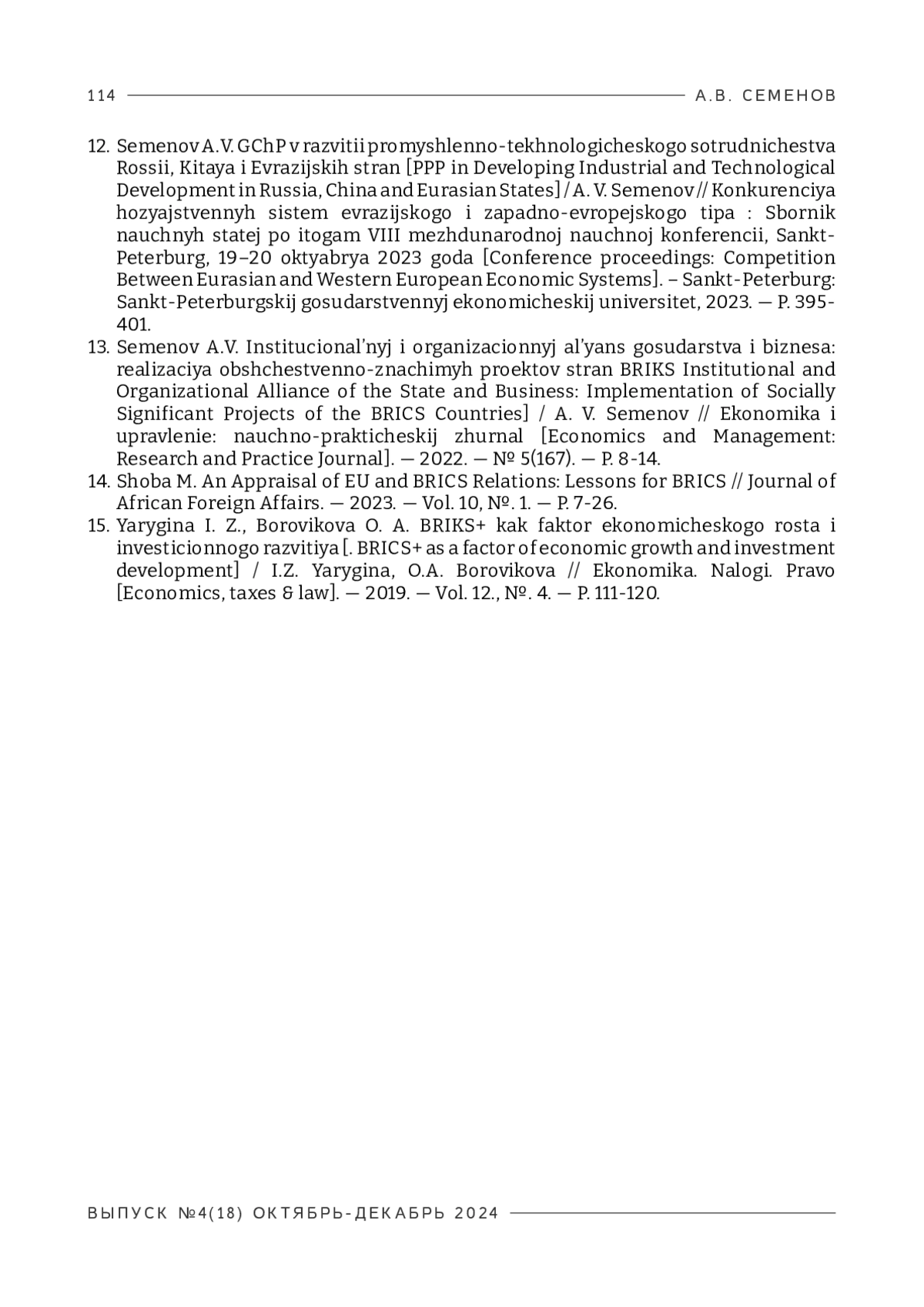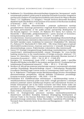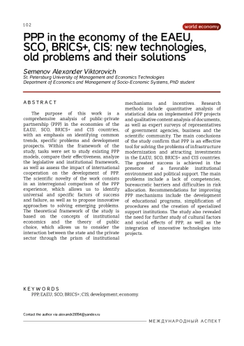 Цель данной работы заключается в комплексном анализе государственно-частного партнёрства (ГЧП) в экономике стран ЕАЭС, ШОС, БРИКС+ и СНГ, с акцентом на выявление общих тенденций, специфических проблем и перспектив развития. В рамках исследования были поставлены задачи по изучению существующих моделей ГЧП, сравнению их эффективности, анализу законодатель ной и институциональной базы, а также оценке влияния международного сотрудничества на развитие ГЧП. Научная новизна работы состоит в межрегиональном сравнении опыта ГЧП, что позволяет вы явить универсальные и специфические факторы успеха и неудач, а также предложить инновационные подходы к решению возникающих проблем. Теоретические рамки исследования базируются на концепциях институциональной экономики и теории публичного выбора, что позволяет рассматривать взаимодействие между государством и частным сектором через призму институциональных механизмов и стимулов. Методы исследования включают количественный анализ статистических данных о реализованных проектах ГЧП и качественный контент-анализ документов, а также экспертные опросы представителей государственных органов, бизнеса и научного сообщества. Основные выводы исследования подтверждают, что ГЧП является эффективным инструментом для решения задач модернизации инфраструктуры и привлечения инвестиций в странах ЕАЭС, ШОС, БРИКС+ и СНГ. Наибольшие успехи достигаются при наличии благоприятной институциональной среды и политической поддержки. Основные проблемы включают недостаток компетенций, бюрократические барьеры и сложности в распределении рисков. Рекомендации по улучшению механизмов ГЧП включают развитие образовательных программ, упрощение процедур и создание специализированных институтов поддержки. Исследование также выявило необходимость дальнейшего изучения культурных факторов и социальных эффектов ГЧП, а также интеграции инновационных технологий в проекты.