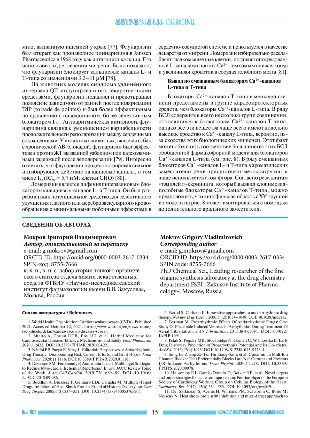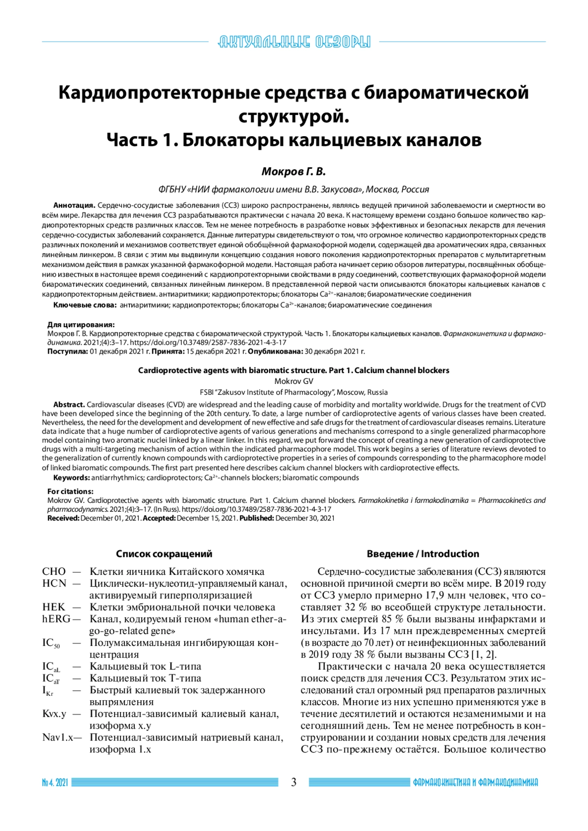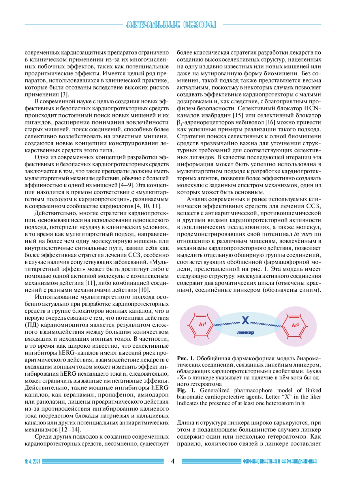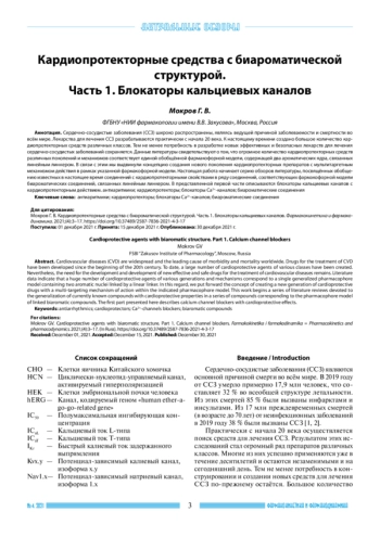 Сердечно-сосудистые заболевания (ССЗ) широко распространены, являясь ведущей причиной заболеваемости и смертности во всём мире. Лекарства для лечения ССЗ разрабатываются практически с начала 20 века. К настоящему времени создано большое количество кардиопротекторных средств различных классов. Тем не менее потребность в разработке новых эффективных и безопасных лекарств для лечения сердечно-сосудистых заболеваний сохраняется. Данные литературы свидетельствуют о том, что огромное количество кардиопротекторных средств различных поколений и механизмов соответствует единой обобщённой фармакофорной модели, содержащей два ароматических ядра, связанных линейным линкером. В связи с этим мы выдвинули концепцию создания нового поколения кардиопротекторных препаратов с мультитаргетным механизмом действия в рамках указанной фармакофорной модели. Настоящая работа начинает серию обзоров литературы, посвящённых обобщению известных в настоящее время соединений с кардиопротекторными свойствами в ряду соединений, соответствующих фармакофорной модели биароматических соединений, связанных линейным линкером. В представленной первой части описываются блокаторы кальциевых каналов с кардиопротекторным действием. антиаритмики; кардиопротекторы; блокаторы Са2+-каналов; биароматические соединения