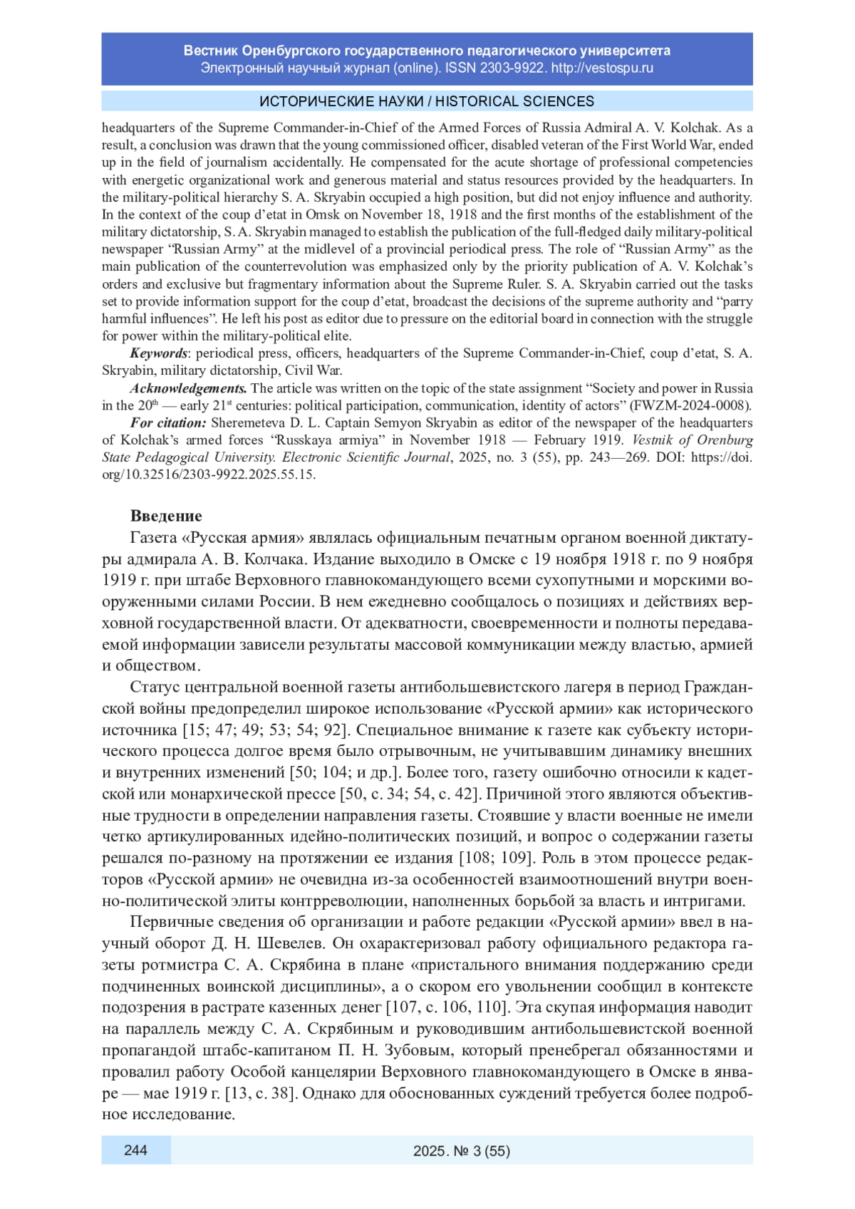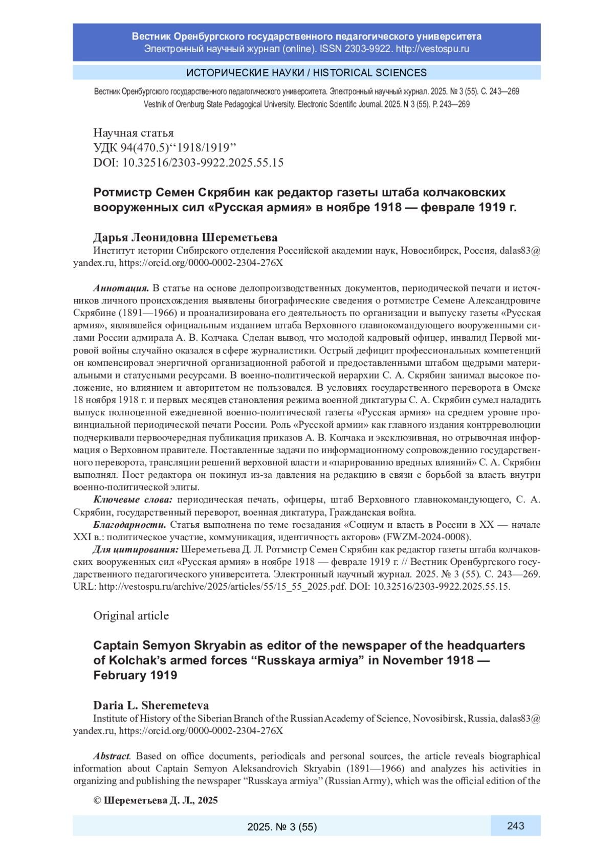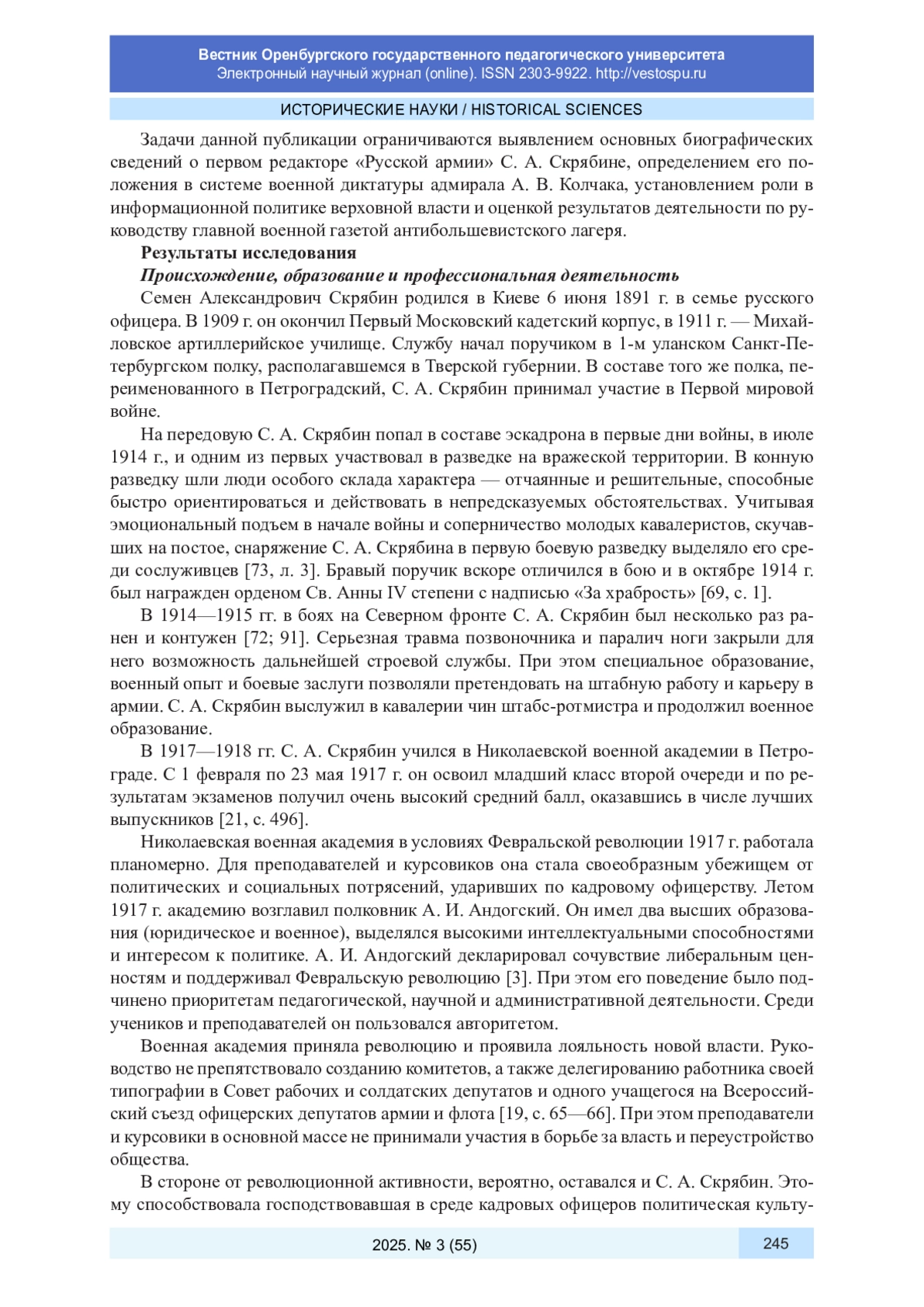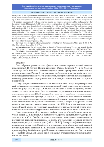 В статье на основе делопроизводственных документов, периодической печати и источников личного происхождения выявлены биографические сведения о ротмистре Семене Александровиче Скрябине (1891-1966) и проанализирована его деятельность по организации и выпуску газеты «Русская армия», являвшейся официальным изданием штаба Верховного главнокомандующего вооруженными силами России адмирала А. В. Колчака. Сделан вывод, что молодой кадровый офицер, инвалид Первой мировой войны случайно оказался в сфере журналистики. Острый дефицит профессиональных компетенций он компенсировал энергичной организационной работой и предоставленными штабом щедрыми материальными и статусными ресурсами. В военно-политической иерархии С. А. Скрябин занимал высокое положение, но влиянием и авторитетом не пользовался. В условиях государственного переворота в Омске 18 ноября 1918 г. и первых месяцев становления режима военной диктатуры С. А. Скрябин сумел наладить выпуск полноценной ежедневной военно-политической газеты «Русская армия» на среднем уровне провинциальной периодической печати России. Роль «Русской армии» как главного издания контрреволюции подчеркивали первоочередная публикация приказов А. В. Колчака и эксклюзивная, но отрывочная информация о Верховном правителе. Поставленные задачи по информационному сопровождению государственного переворота, трансляции решений верховной власти и «парированию вредных влияний» С. А. Скрябин выполнял. Пост редактора он покинул из-за давления на редакцию в связи с борьбой за власть внутри военно-политической элиты.