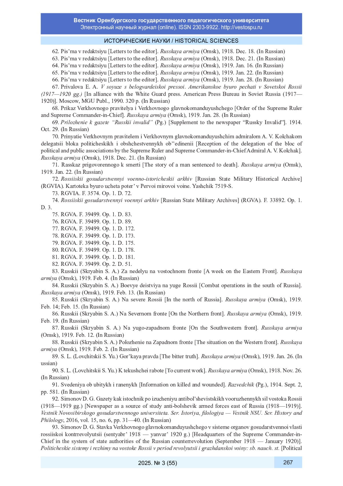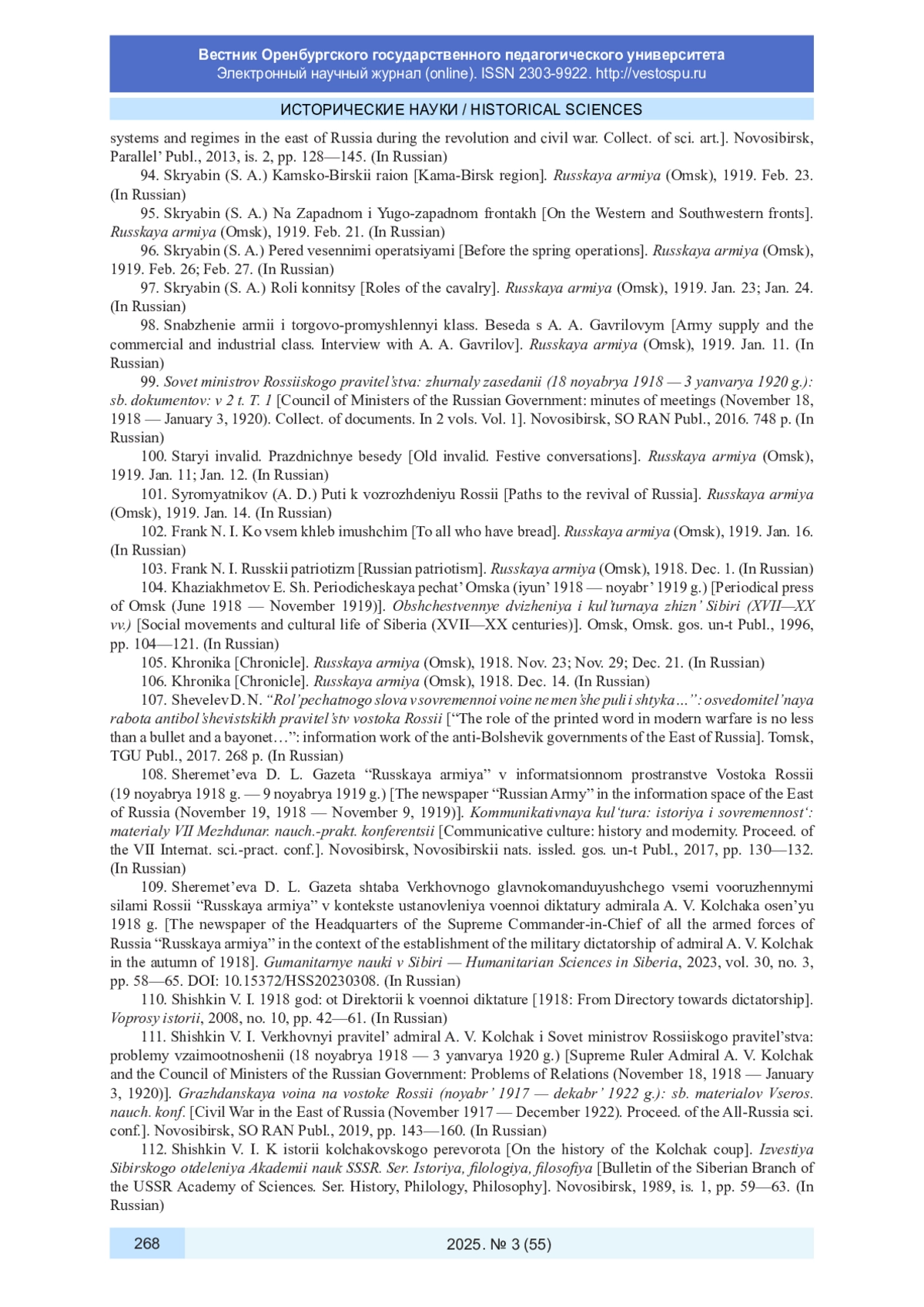 109. Шереметьева Д. Л. Газета штаба Верховного главнокомандующего всеми вооруженными силами России “Русская армия” в контексте установления военной диктатуры адмирала А. В. Колчака осенью 1918 г. // Гуманитарные науки в Сибири. 2023. Т. 30, № 3. С. 58-65. DOI: 10.15372/HSS20230308 EDN: JACFMK