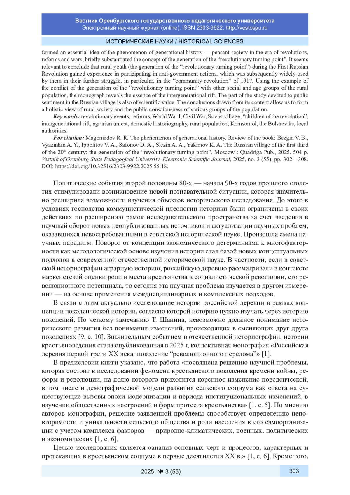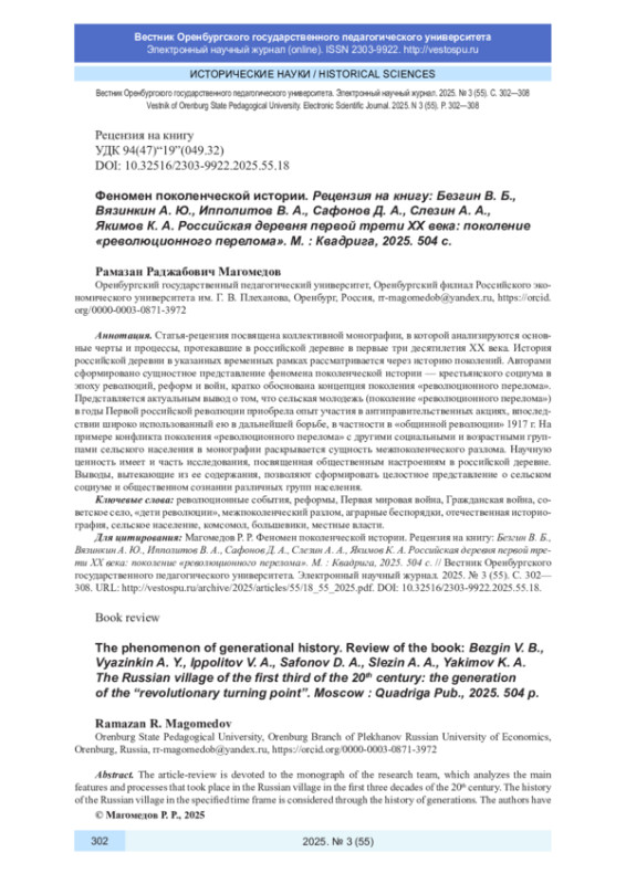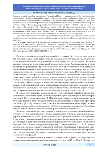 1. Безгин В. Б., Вязинкин А. Ю., Ипполитов В. А., Сафонов Д. А., Слезин А. А., Якимов К. А. Российская деревня первой трети XX века: поколение “революционного перелома”. М.: Квадрига, 2025. 504 с. EDN: KDEXZN