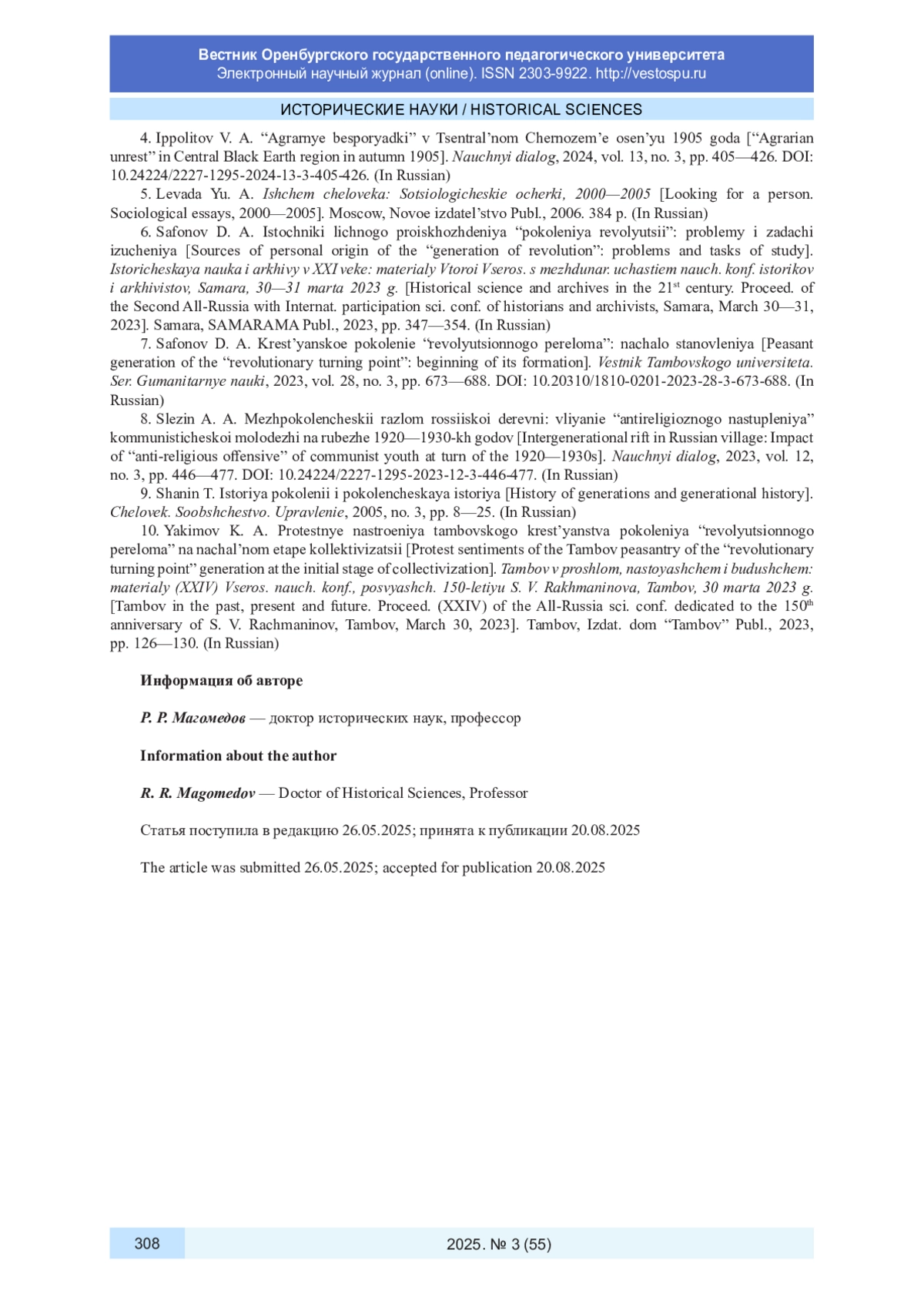 7. Сафонов Д. А. Крестьянское поколение “революционного перелома”: начало становления // Вестник Тамбовского университета. Сер. Гуманитарные науки. 2023. Т. 28, № 3. С. 673-688. DOI: 10.20310/1810-0201-2023-28-3-673-688