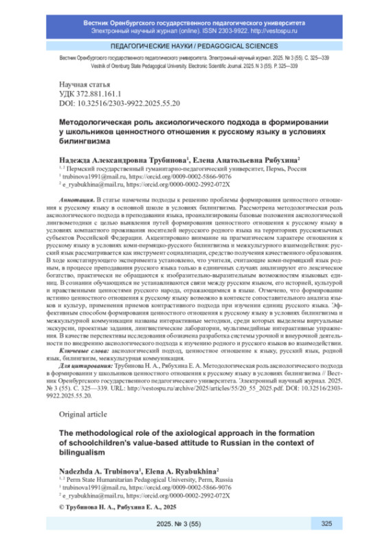 22. Трубинова Н. А., Рябухина Е. А. Виртуальная экскурсия как способ формирования ценностного отношения к родному языку // Пермистика 20: Диалекты и история пермских языков во взаимодействии с другими языками: сб. статей / УдмФИЦ УрО РАН. Ижевск, 2025. С. 266-274.