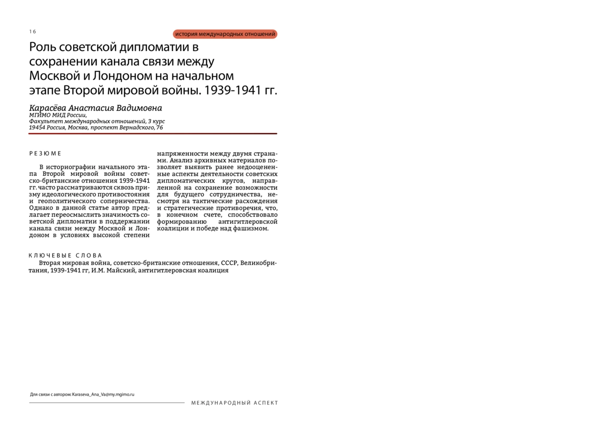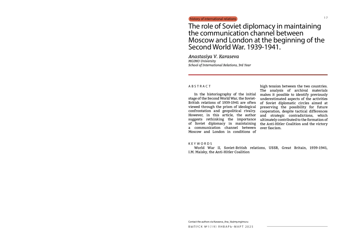 В историографии начального этапа Второй мировой войны советско-британские отношения 1939-1941 гг. часто рассматриваются сквозь призму идеологического противостояния и геополитического соперничества. Однако в данной статье автор предлагает переосмыслить значимость советской дипломатии в поддержании канала связи между Москвой и Лондоном в условиях высокой степени напряженности между двумя странами. Анализ архивных материалов позволяет выявить ранее недооцененные аспекты деятельности советских дипломатических кругов, направленной на сохранение возможности для будущего сотрудничества, несмотря на тактические расхождения и стратегические противоречия, что, в конечном счете, способствовало формированию антигитлеровской коалиции и победе над фашизмом.
