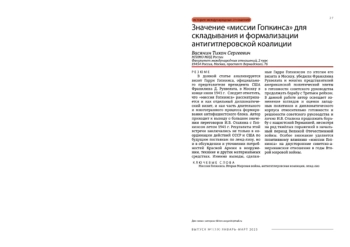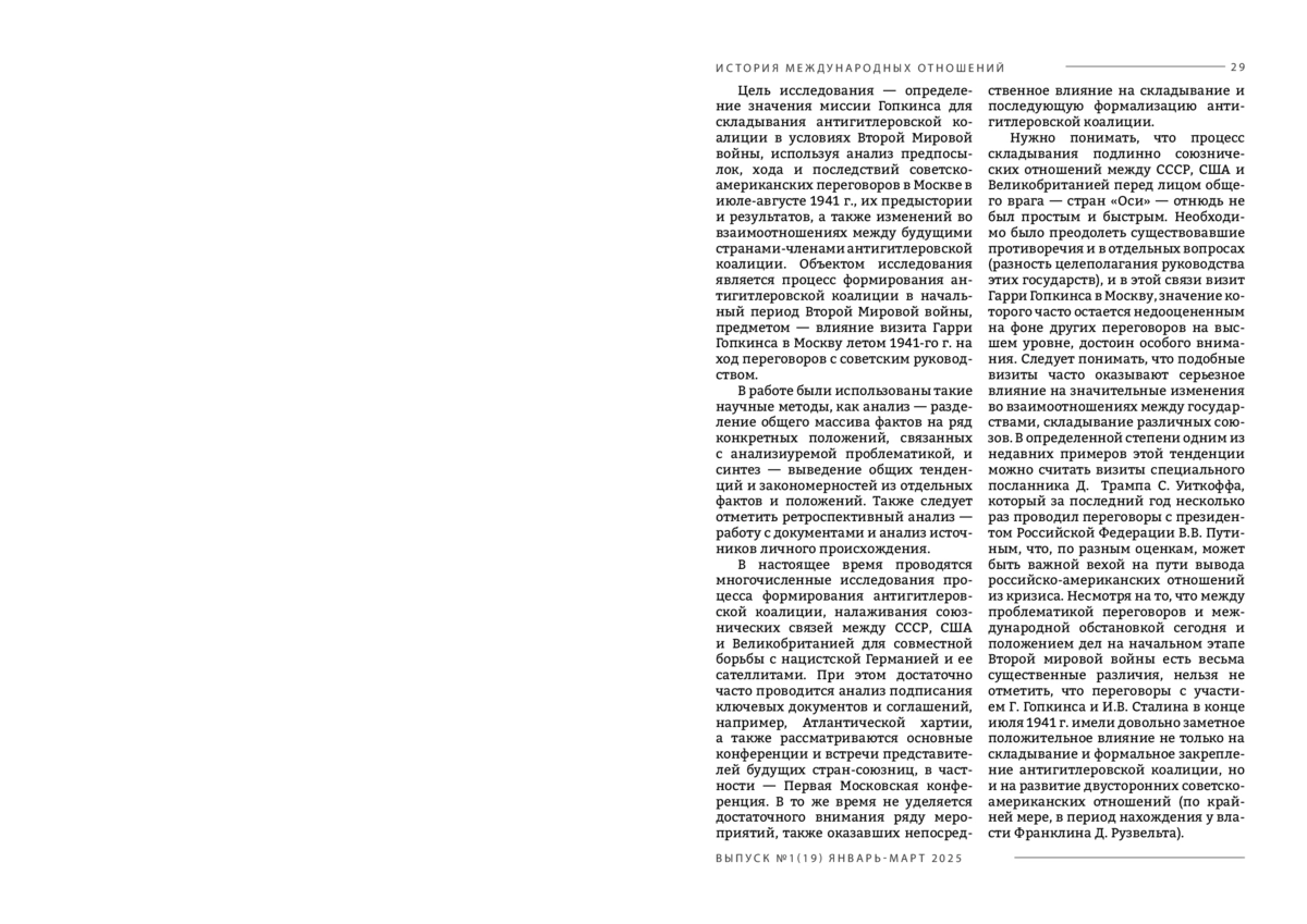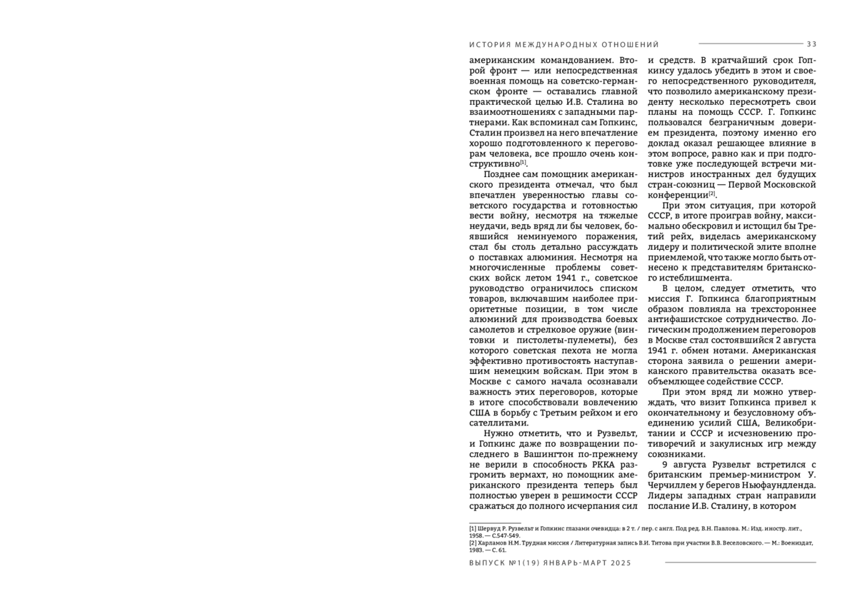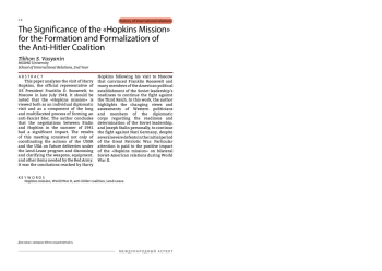 В данной статье анализируется визит Гарри Гопкинса, официального представителя президента США Франклина Д. Рузвельта, в Москву в конце июля 1941 г. Следует отметить, что «миссия Гопкинса» рассматривается и как отдельный дипломатический визит, и как часть длительного и многогранного процесса формирования антифашистского блока. Автор приходит к выводу о большом значении переговоров И. В. Сталина с Гопкинсом летом 1941 г. Результаты этой встречи заключались не только в координации действий СССР и США по будущим поставкам по ленд-лизу, но и в обсуждении и уточнении потребностей Красной Армии в вооружении, технике и других материальных средствах. Именно выводы, сделанные Гарри Гопкинсом по итогам его визита в Москву, убедили Франклина Рузвельта и многих представителей американской политической элиты в готовности советского руководства продолжать борьбу с Третьим рейхом. В данной работе автор освещает изменение взглядов и оценок западных политиков и дипломатического корпуса относительно готовности и решимости советского руководства и лично И. В. Сталина продолжать борьбу с нацистской Германией, несмотря на ряд тяжёлых поражений в начальный период Великой Отечественной войны. Особое внимание уделяется позитивному влиянию «миссии Гопкинса» на двусторонние советско-американские отношения в годы Второй мировой войны.